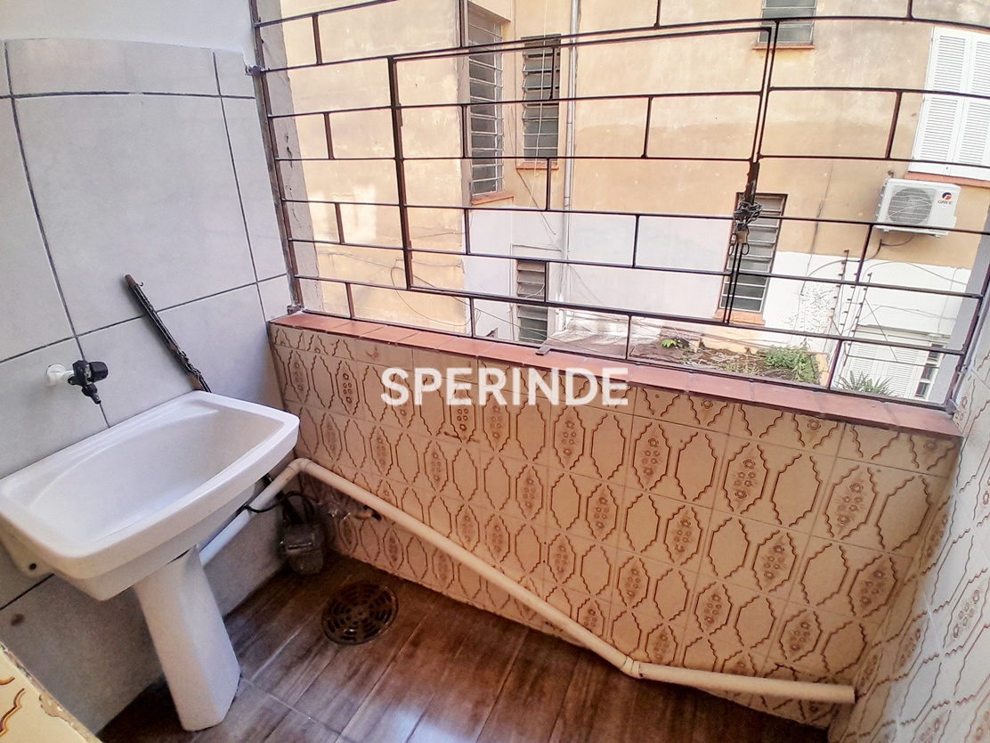 Apartamento para alugar no bairro São João, em Porto Alegre, com 2 dormitórios, sala com sacada, cozinha, área de serviço e banheiro social. O imóvel possui piso em parquet nas áreas secas e cerâmica nas áreas molhadas, distribuindo os ambientes entre área social e área de serviço.