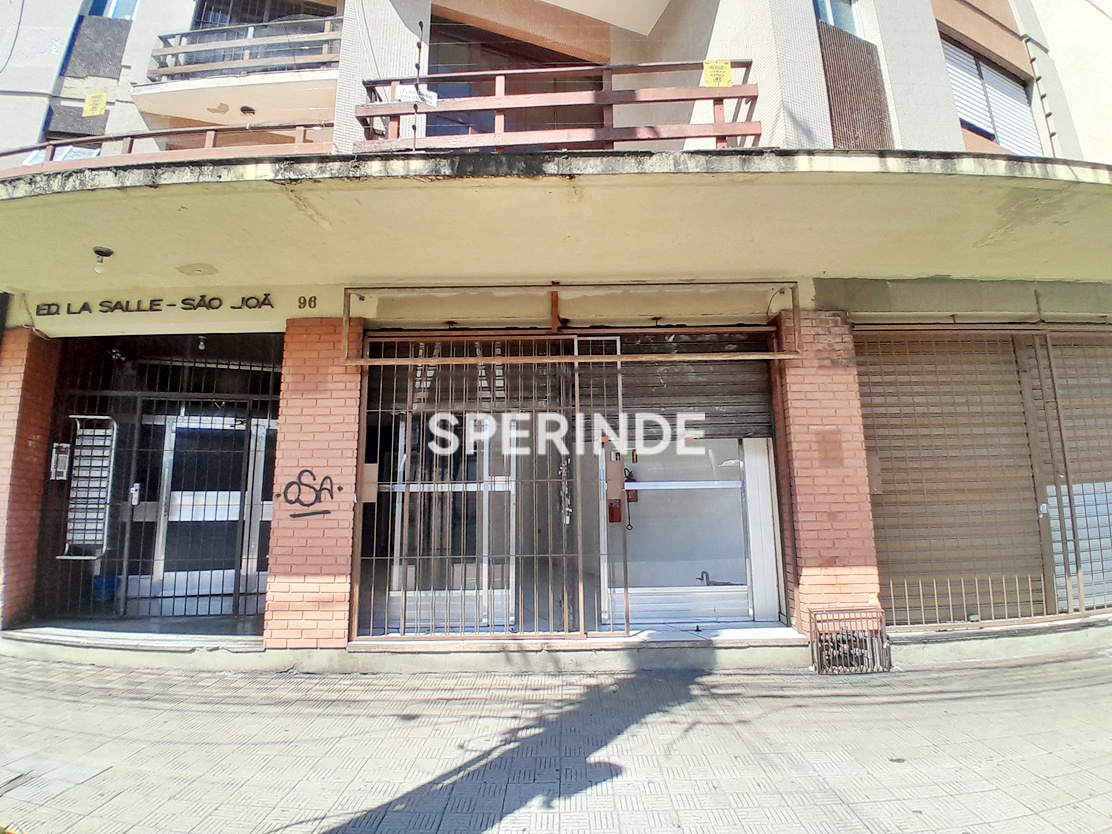 A loja possui vitrine em vidro com estrutura em alumínio, permitindo exposição para a rua. A fachada conta com cortinas de ferro e gradil externo, oferecendo fechamento frontal e acesso direto ao imóvel no bairro São João, em Porto Alegre.