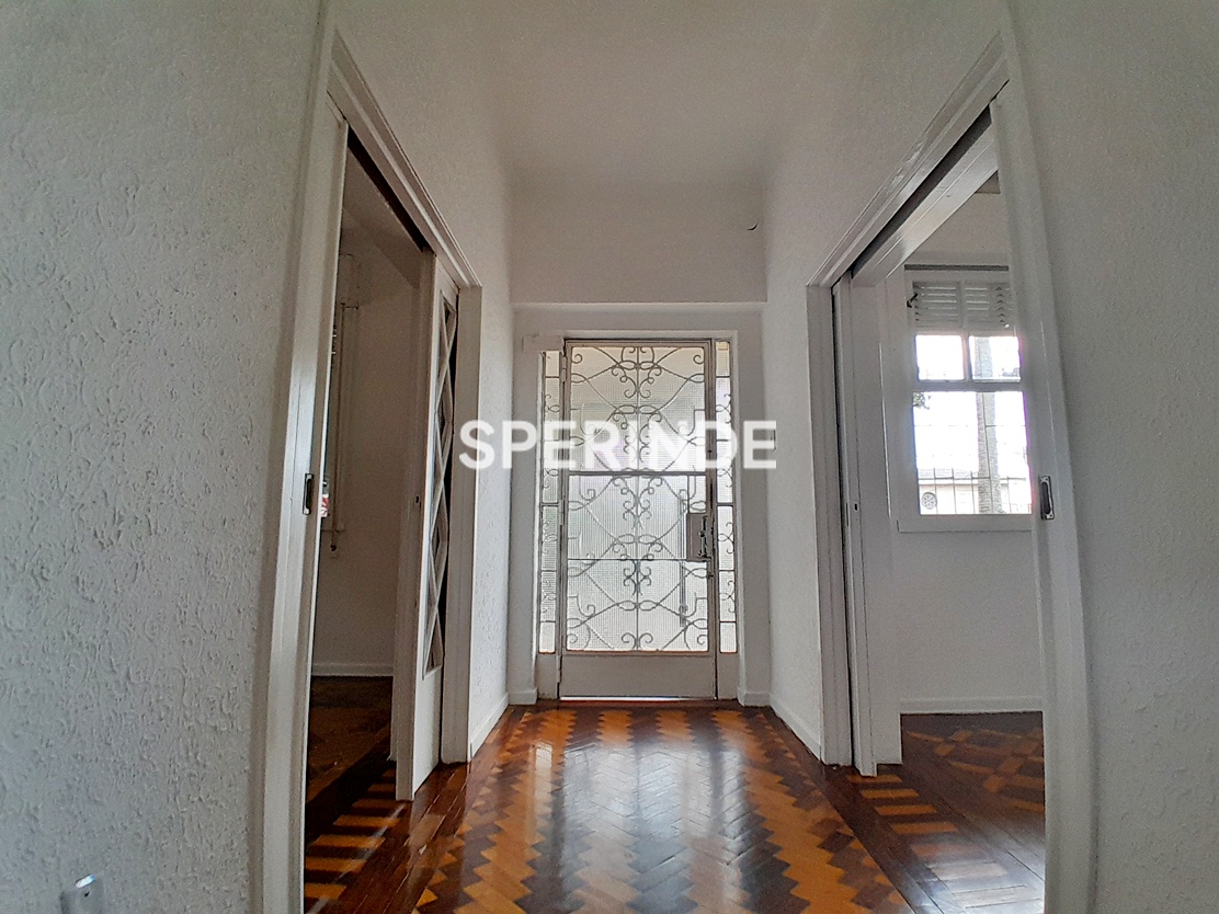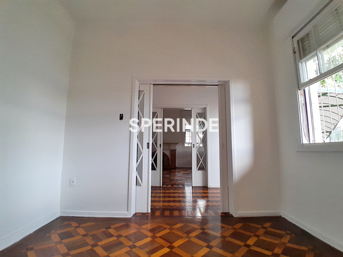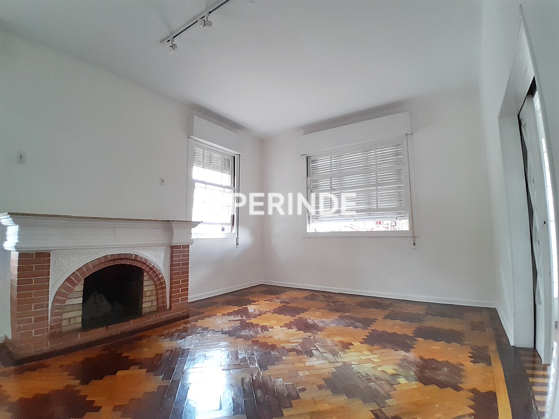 Casa grande no bairro São João, em Porto Alegre, com parte superior composta por sala ampla com lareira, quatro salas adicionais, banheiro com adaptações, cozinha, despensa e pátio amplo nos fundos. O imóvel apresenta piso em cerâmica e parquet, com ambientes distribuídos de forma funcional.