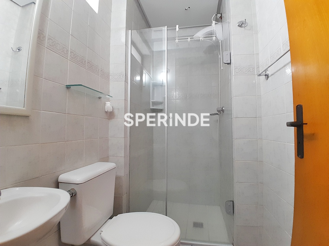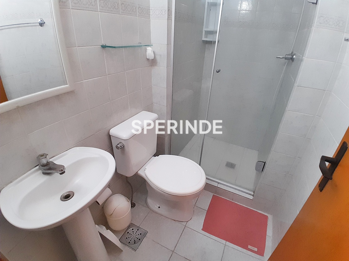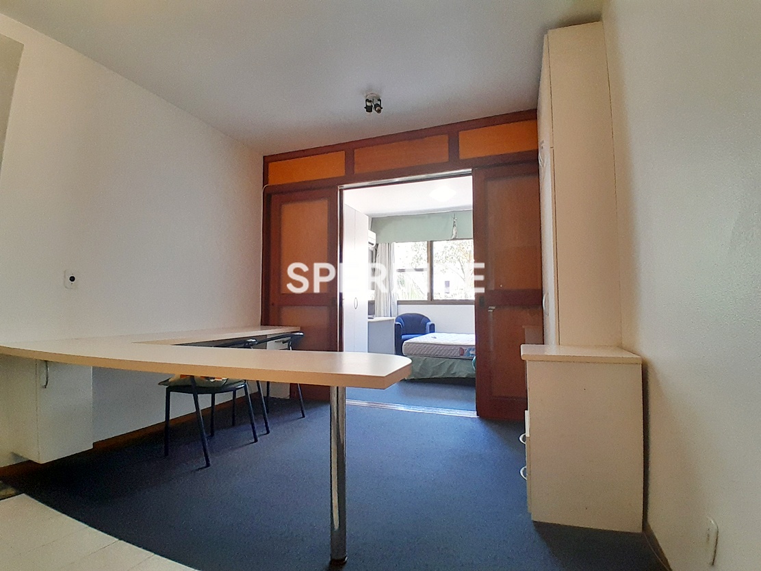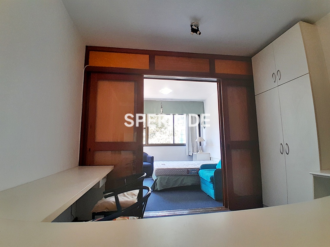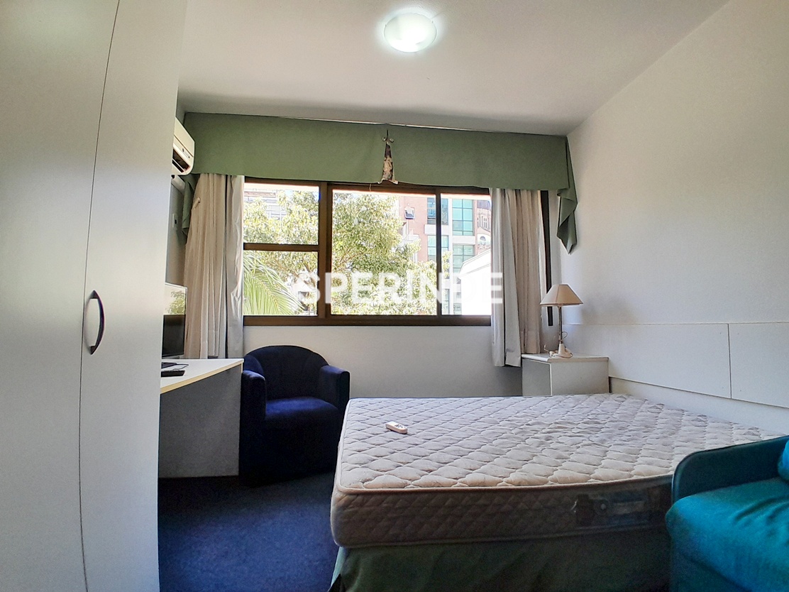 Permanece mobiliado com cama, roupeiro, ar-condicionado split, mesa, poltronas, geladeira e micro-ondas. O banheiro possui box de vidro. O prédio é simples e dispõe de elevadores.