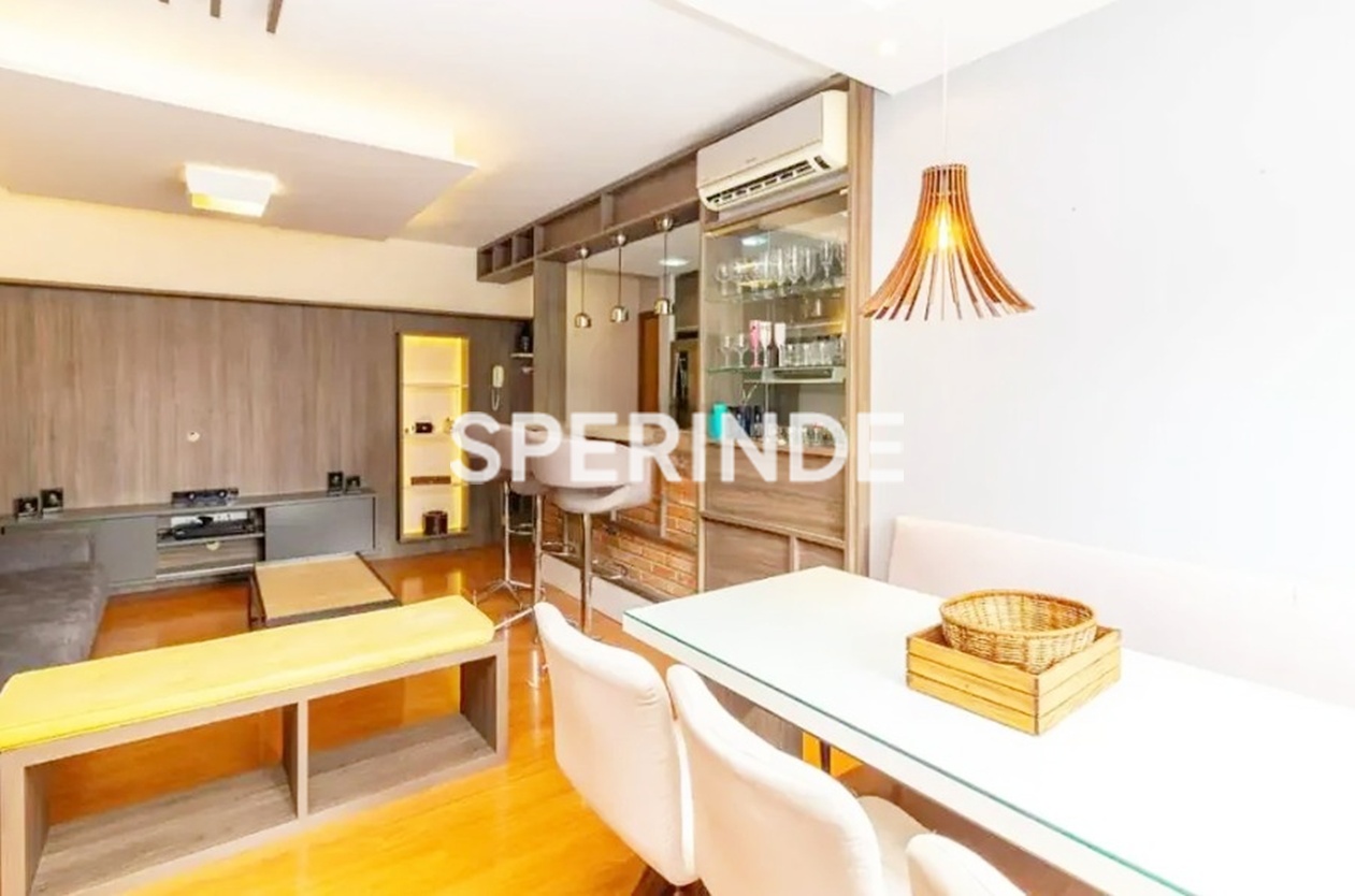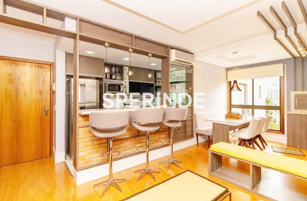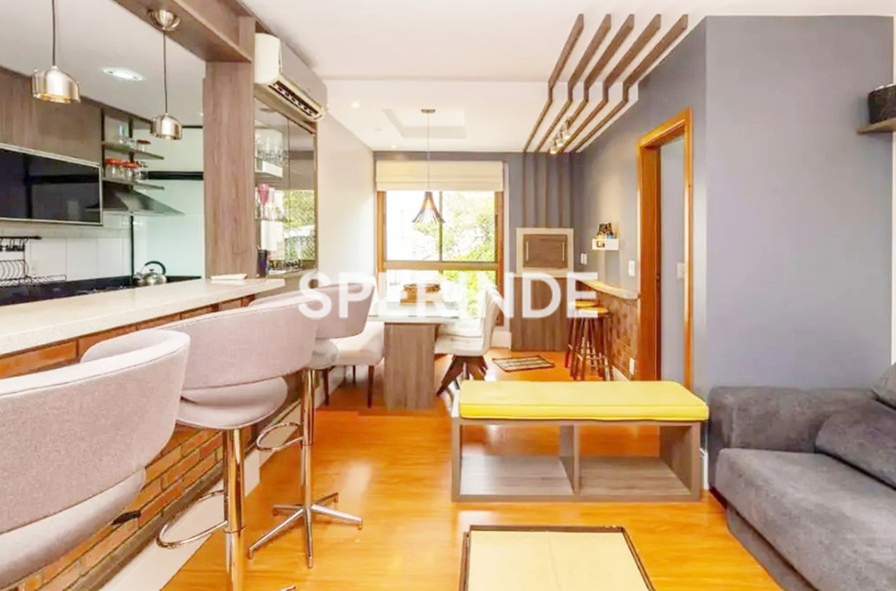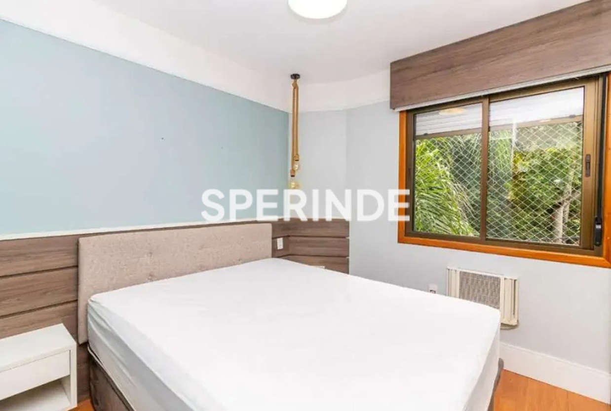 Apartamento 2 quartos, sendo 1 suíte no bairro Petrópolis em Porto Alegre, 2 banheiros, piso laminado, 72,00 m², 1 vaga de garagem, mobiliado, ótima posição solar. Living estar/jantar integrados com churrasqueira, sofá, mesa com cadeiras, suíte casal com armários e ar, banheiro suíte com armário e box, quarto de solteiro com armários e split, banheiro social com armário, cozinha americana com armários, geladeira, forno, micro cooktop e coifa, área de serviço com máquina de lavar roupa e junker.