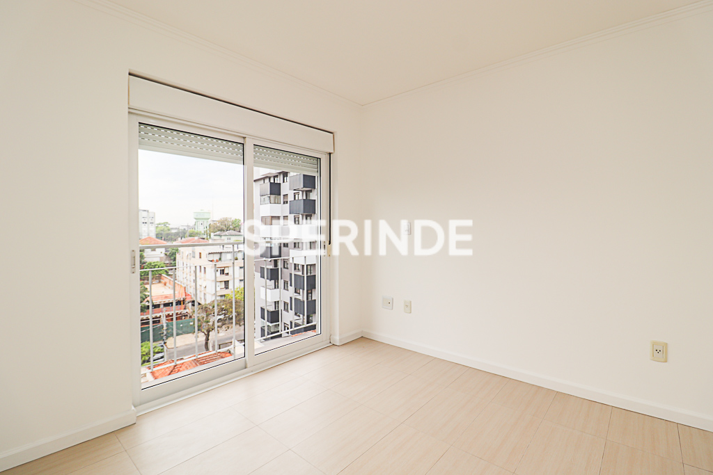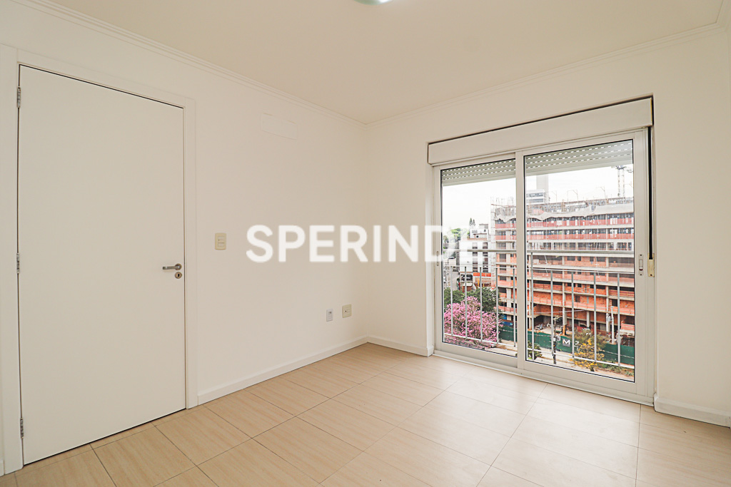 Apartamento no bairro Petrópolis, em Porto Alegre, composto por 01 dormitório, sala com lareira, cozinha equipada com churrasqueira, área de serviço e banheiro com box de vidro. O imóvel possui piso em porcelanato e aquecedor de água a gás.