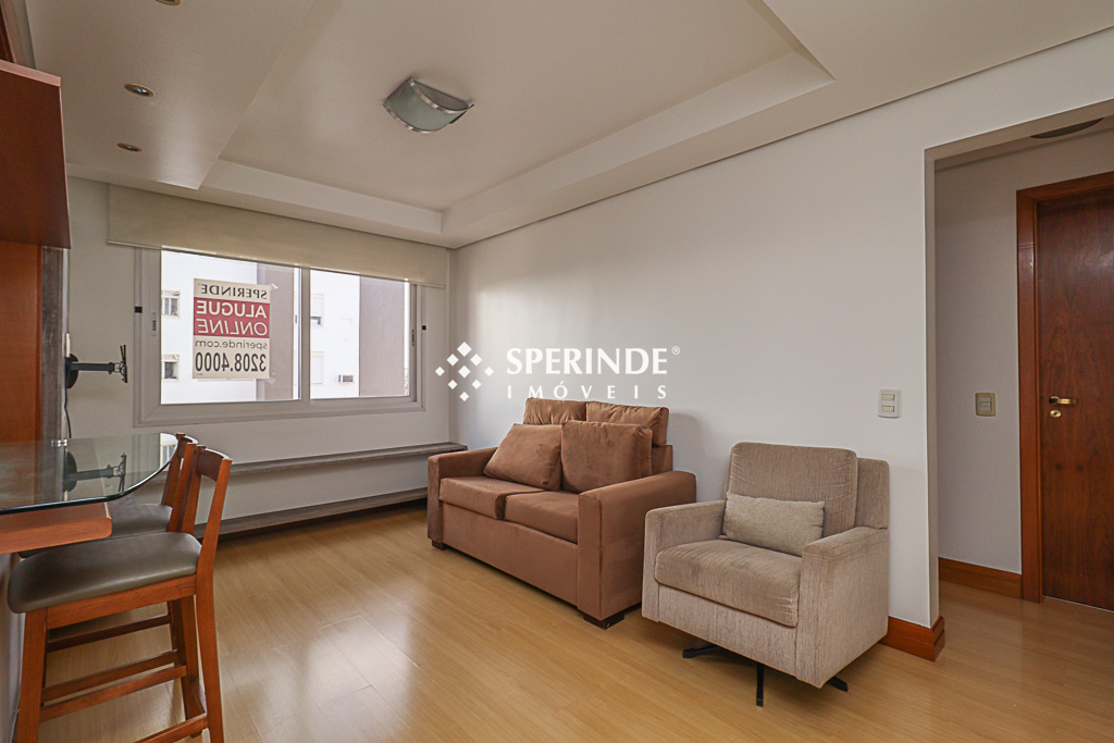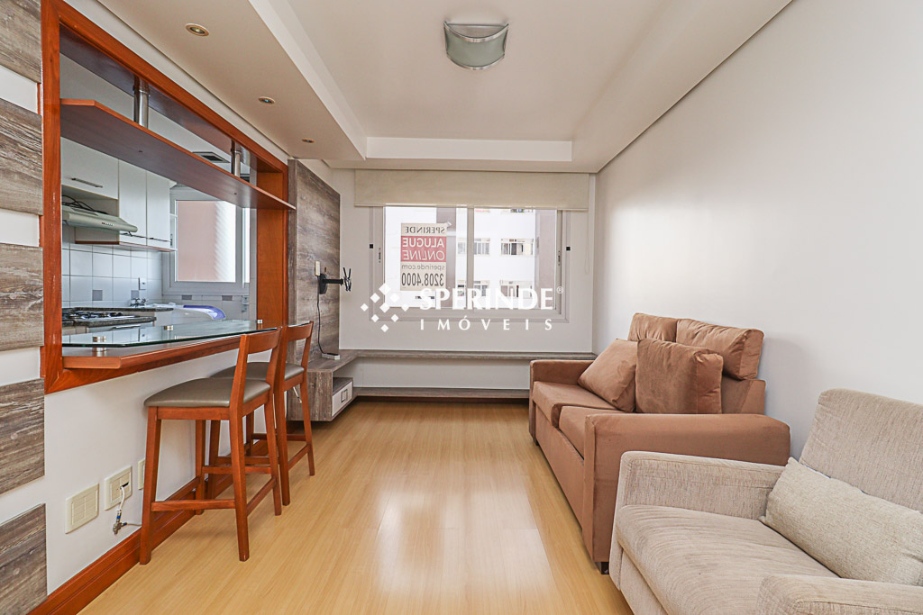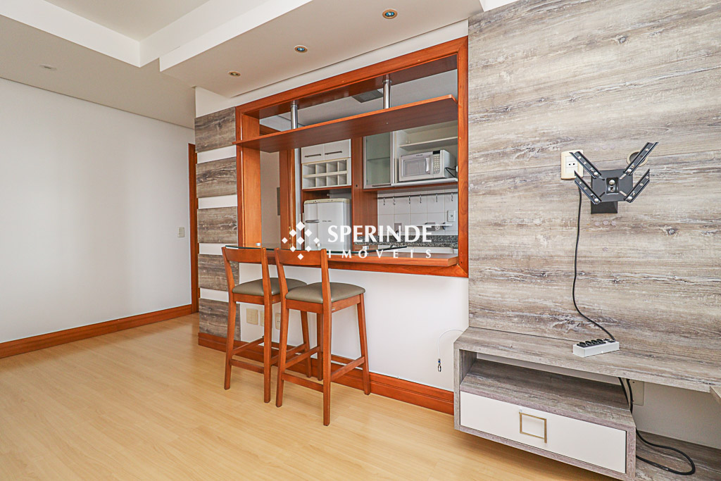 Apartamento próximo à Plínio Brasil Milano, no Bairro Boa Vista, com 1 quarto, 1 banheiro, 42,10m², mobiliado, com vaga de garagem, andar alto com vista, ensolarado e arejado. Sala de estar com sofá e poltrona, cozinha americana com armários e eletrodomésticos, quarto com armário e split, banheiro com armário e box.