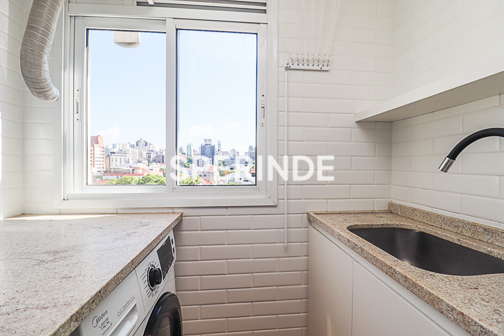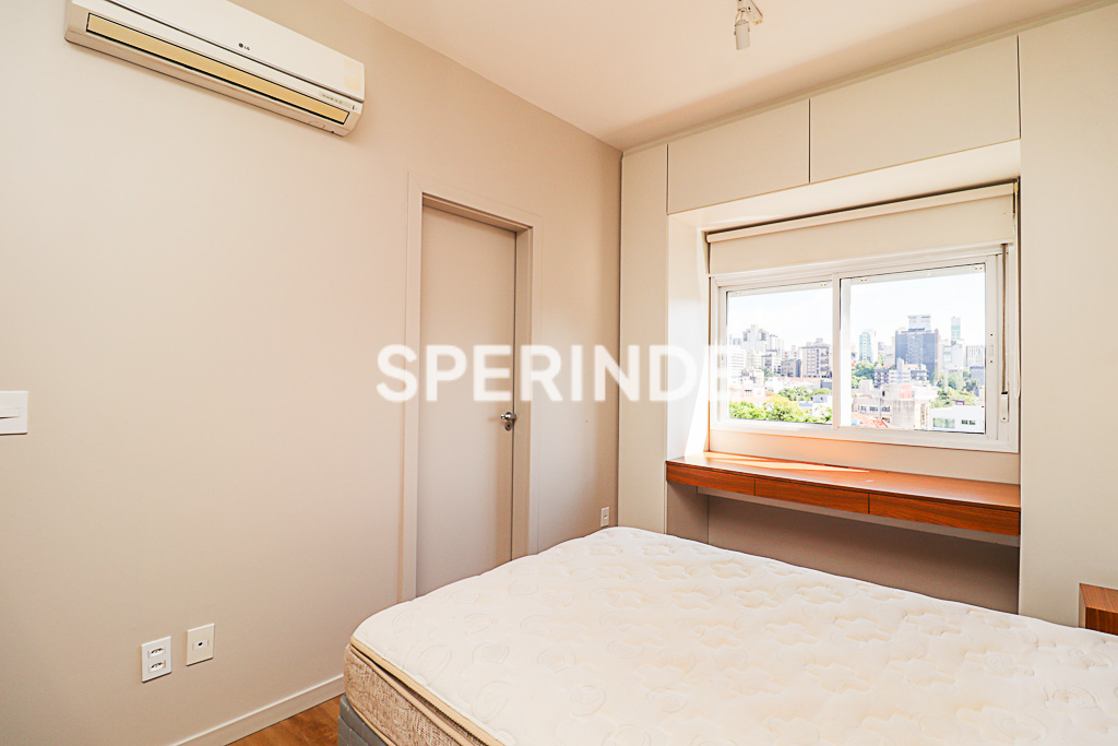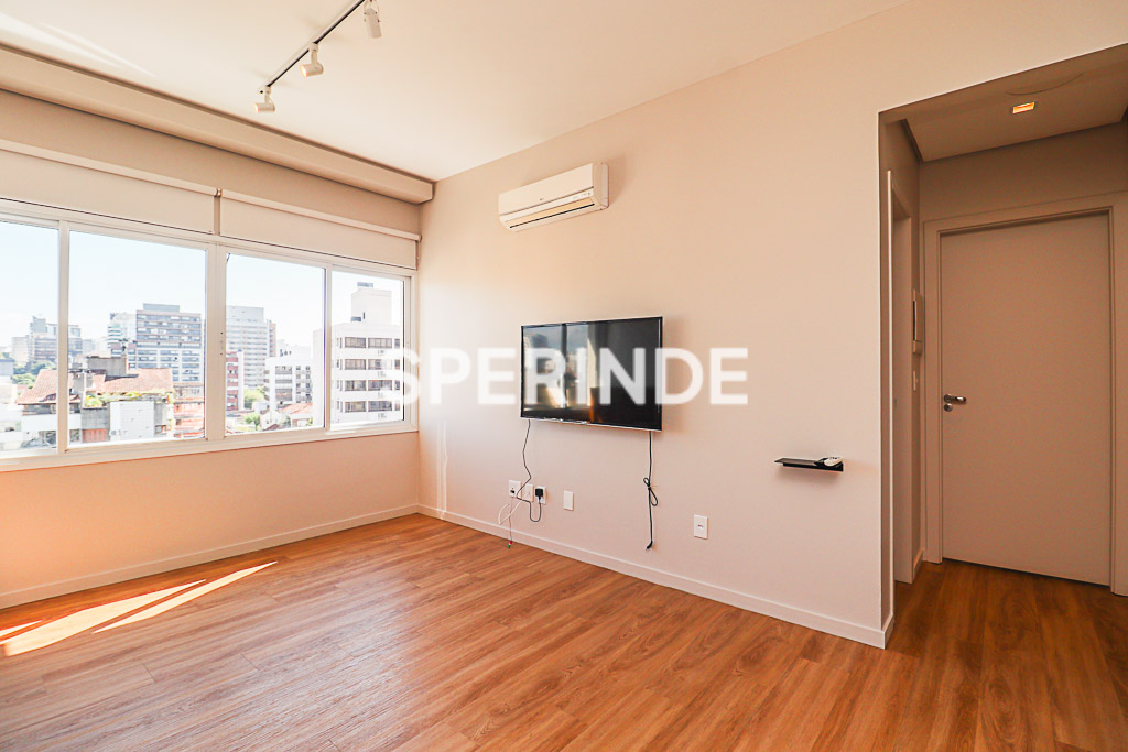 Apartamento semi mobiliado no bairro Rio Branco, em Porto Alegre. Imóvel composto por 01 suíte, sala com televisão e ar-condicionado split, cozinha com churrasqueira integrada à área de serviço e lavabo. Piso vinílico em todos os ambientes, banheiro da suíte com box de vidro e aquecedor de água a gás instalado.