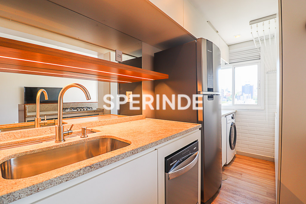 Cozinha equipada com armários sob medida, geladeira, fogão cooktop, forno, micro-ondas e máquina de lavar louças. Área de serviço com armários sob medida, máquina de lavar e varal suspenso. Suíte com armário sob medida, ar-condicionado split e cama box de casal. Porta de entrada com fechadura digital por senha. Condomínio com salão de festas.