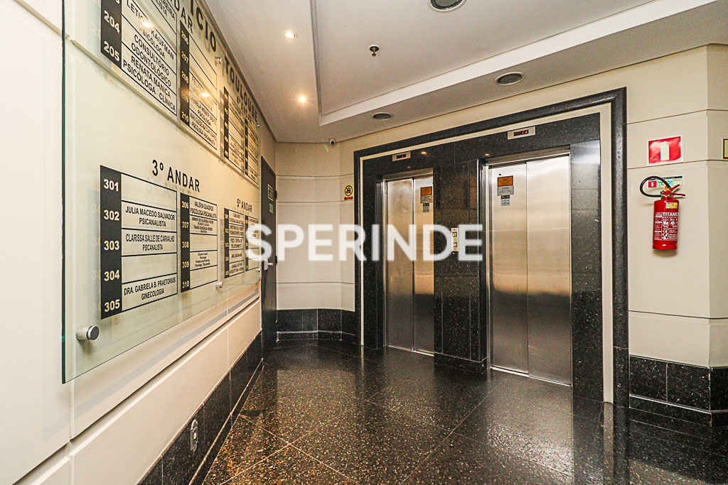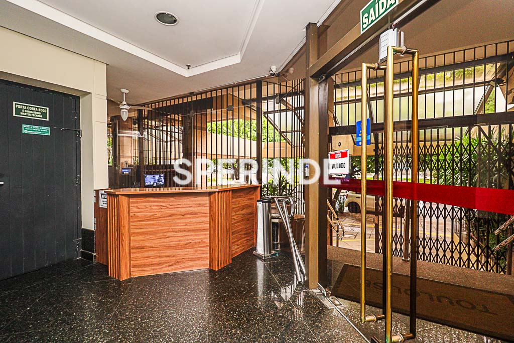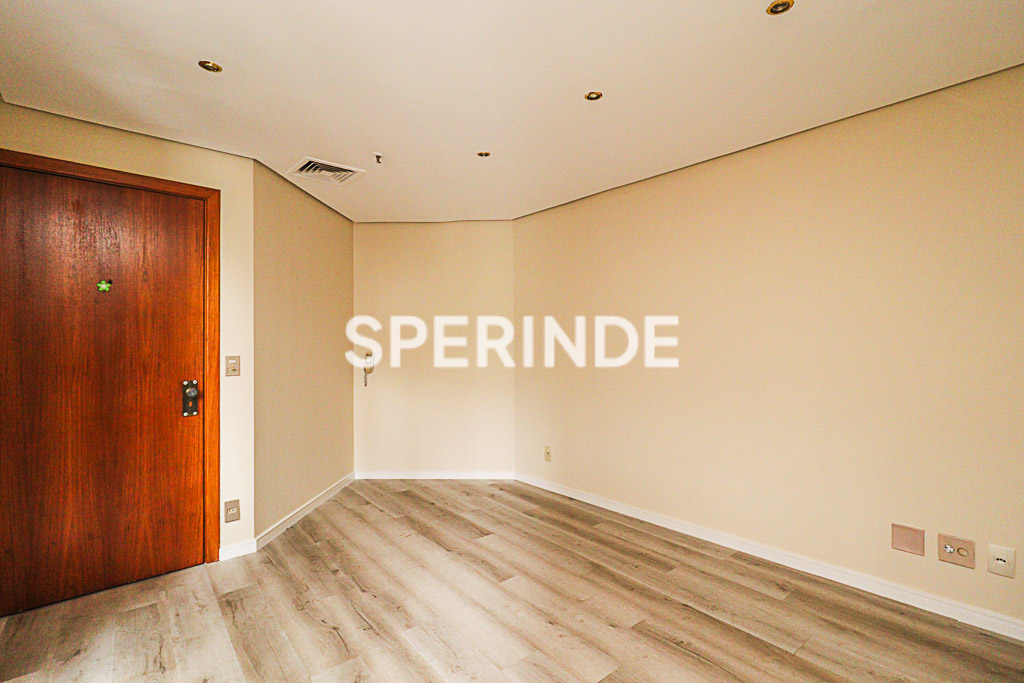 Sala no bairro Moinhos de Vento, 1 banheiro, 25,56 m², 3° andar, posição fundos, posição solar oeste, recepção, sala com prateleiras, armários, split, piso carpete.