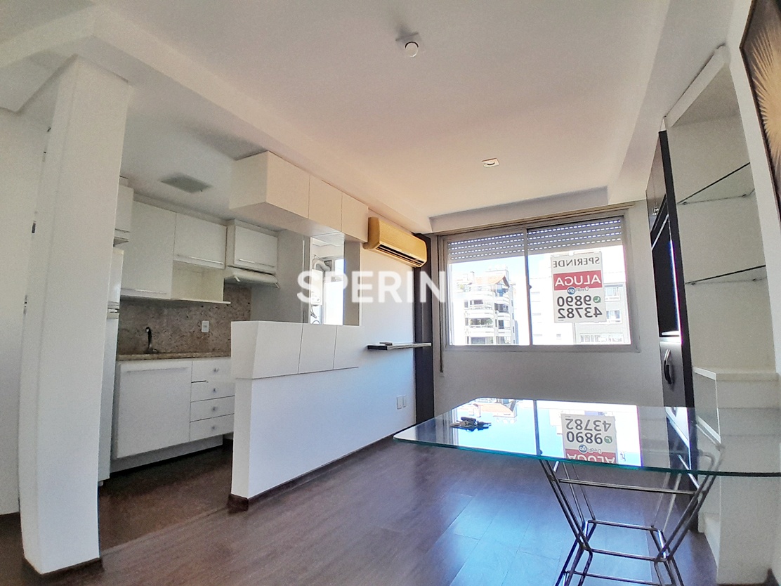 Apartamento semi mobiliado no bairro Higienópolis em Porto Alegre, composto de 01 dormitório, sala, banheiro social, cozinha e área de serviço. O imóvel possui piso em laminado e cerâmica, com cozinha, sala e dormitório equipados com móveis sob medida, proporcionando melhor aproveitamento do espaço.