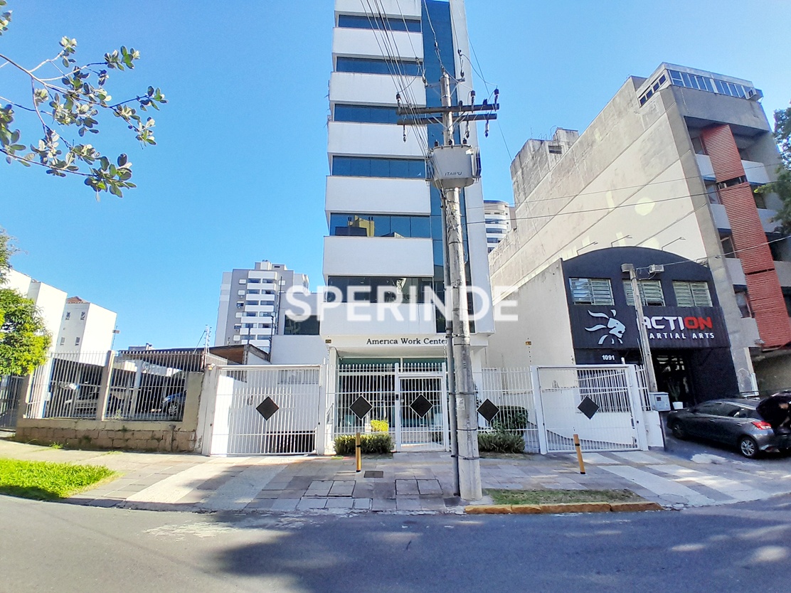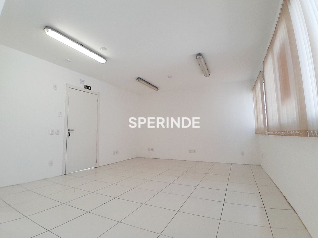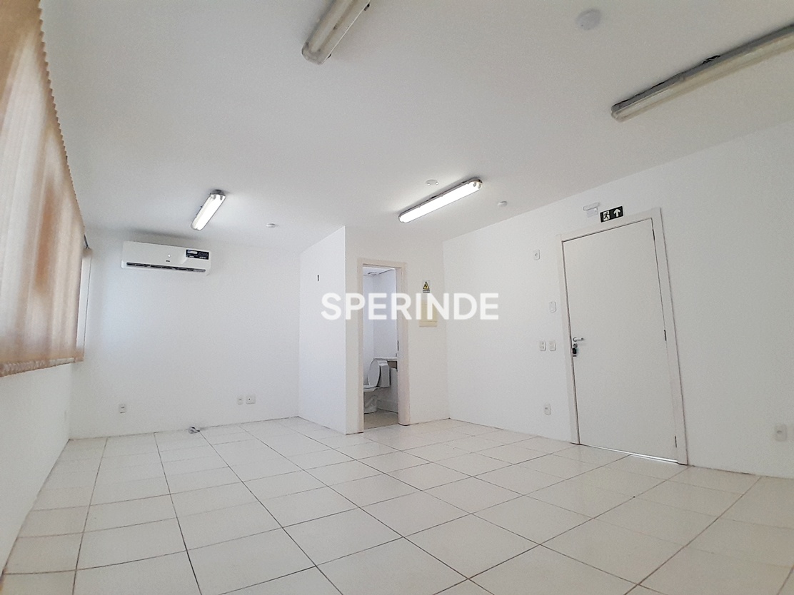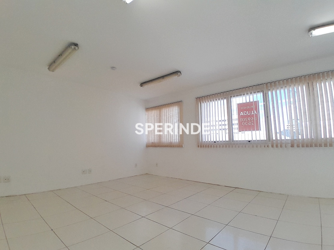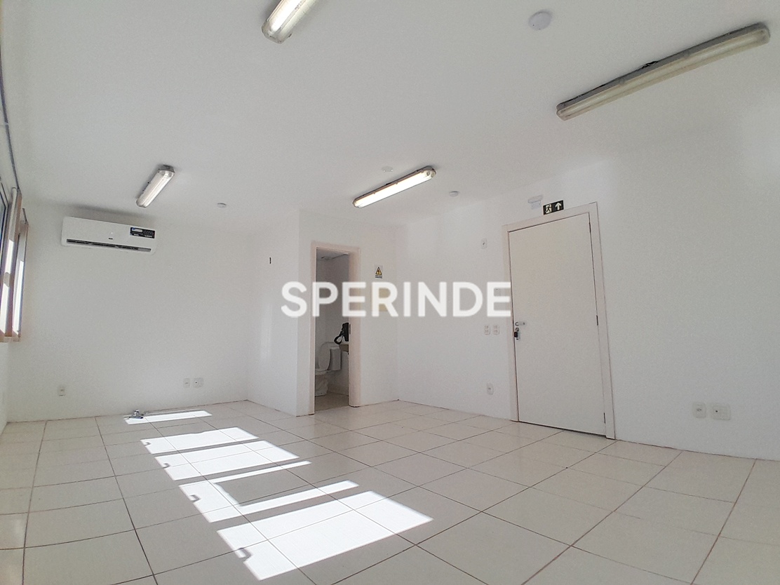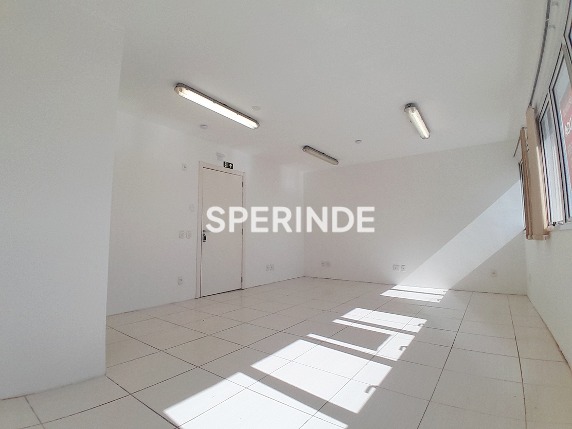 A sala conta com cortinas tipo persianas e ar-condicionado split. O prédio é exclusivamente comercial e dispõe de portaria e elevador, garantindo controle de acesso e circulação interna.