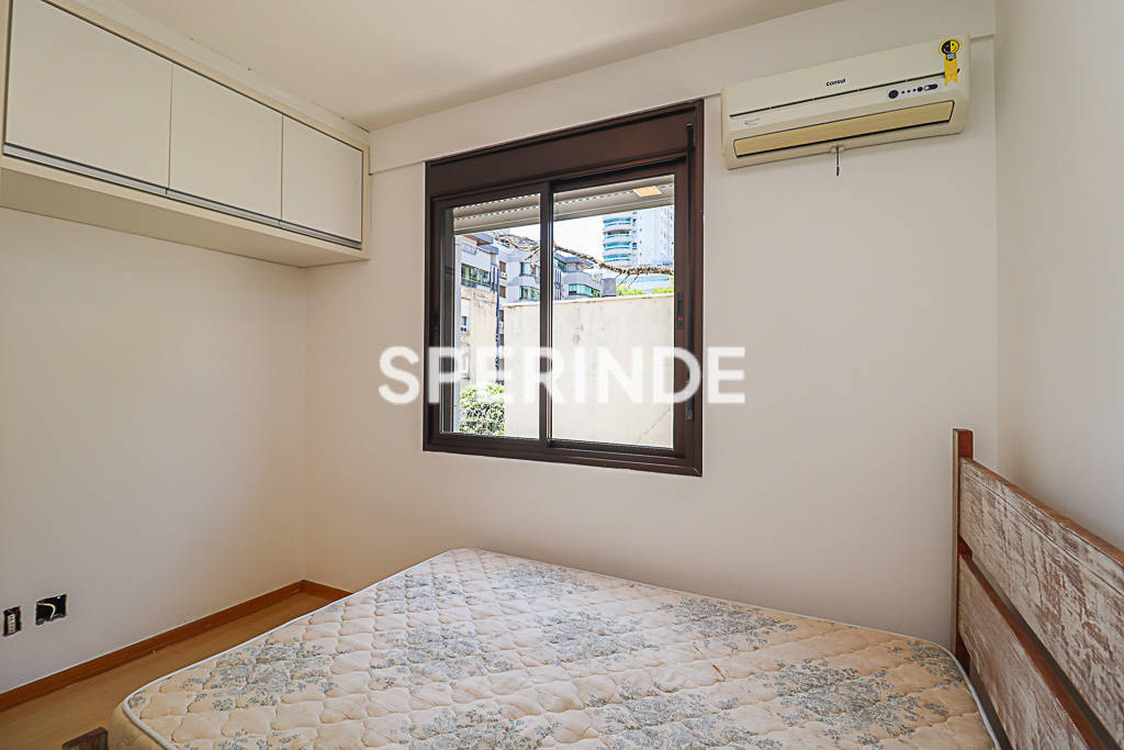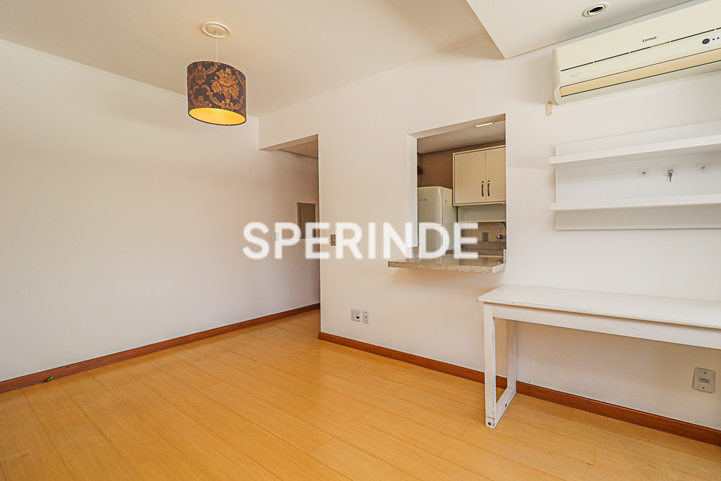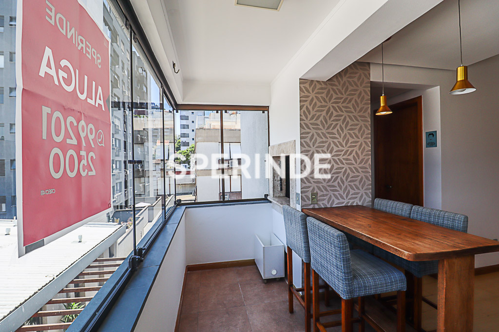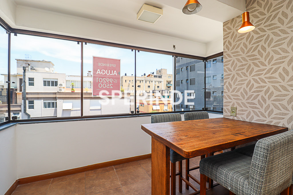Apartamento semi mobiliado no bairro Petrópolis, em Porto Alegre, composto de um dormitório, sala com sacada e churrasqueira, banheiro social e cozinha conjugada com área de serviço. O imóvel possui piso em laminado e cerâmica, além de sala equipada com mesa, bancada e ar-condicionado split.