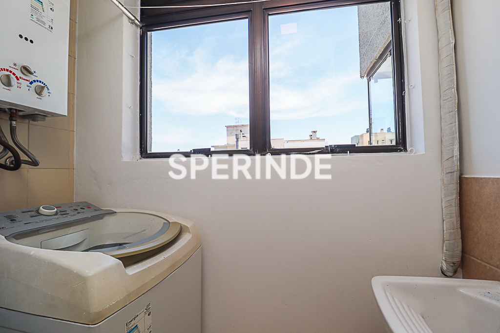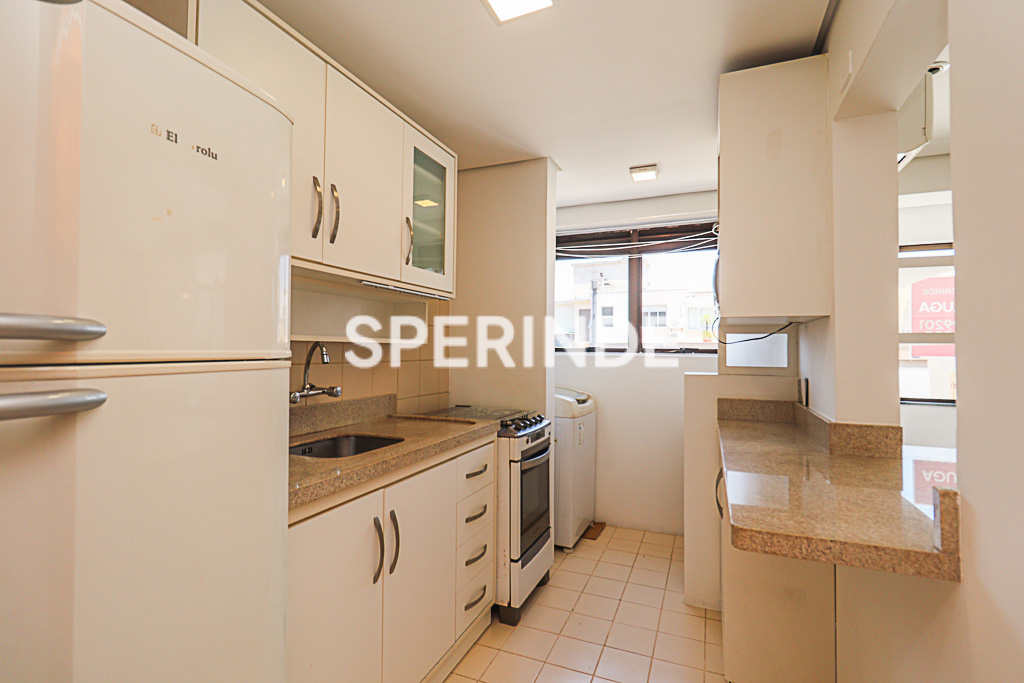 O dormitório conta com cama, roupeiros sob medida e ar-condicionado split. A cozinha é equipada com armários, geladeira, fogão e máquina de lavar. O prédio é simples e dispõe de elevador.