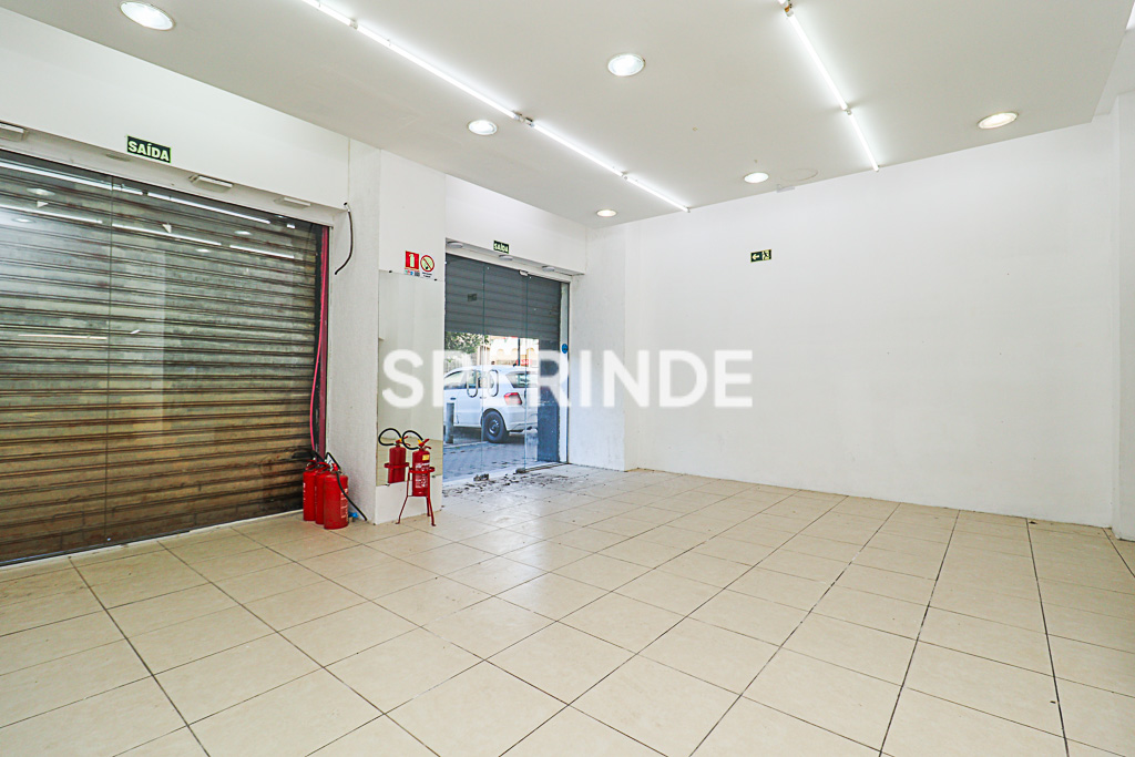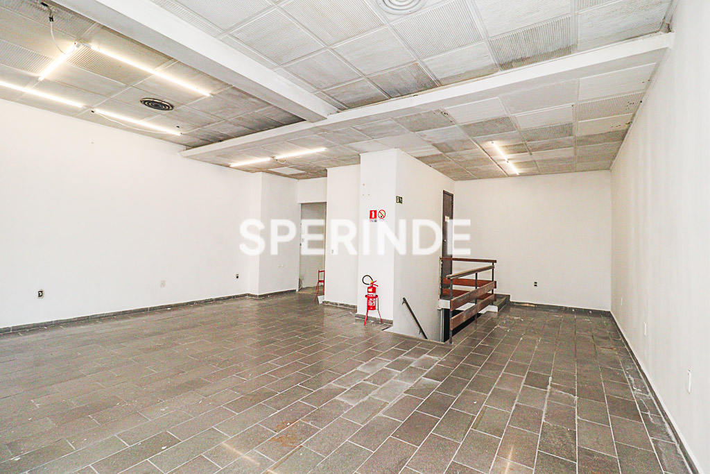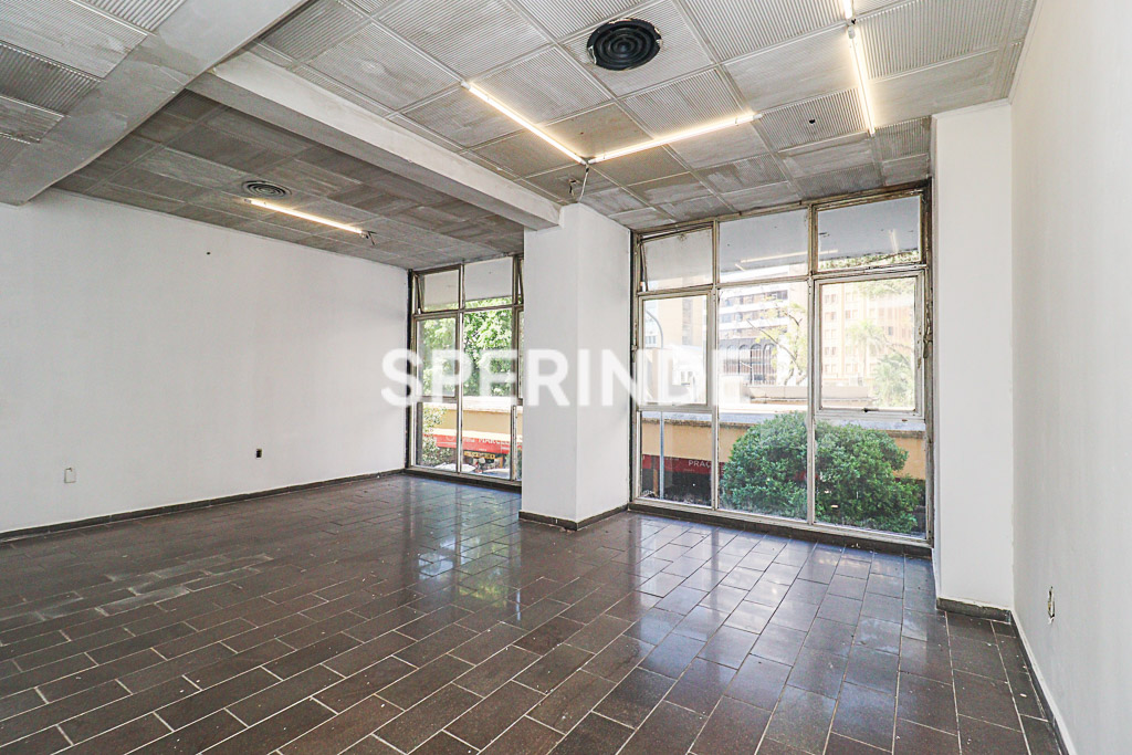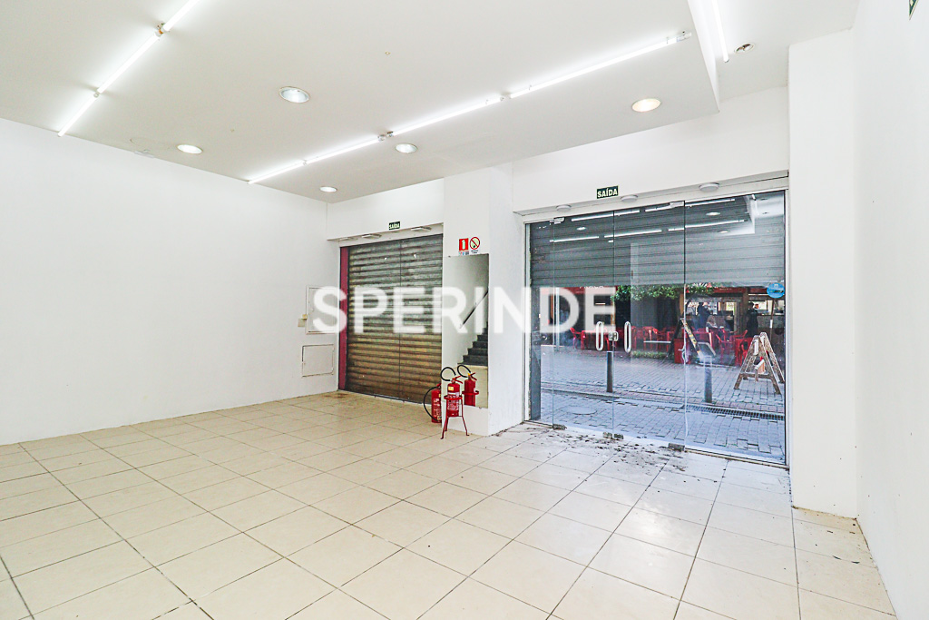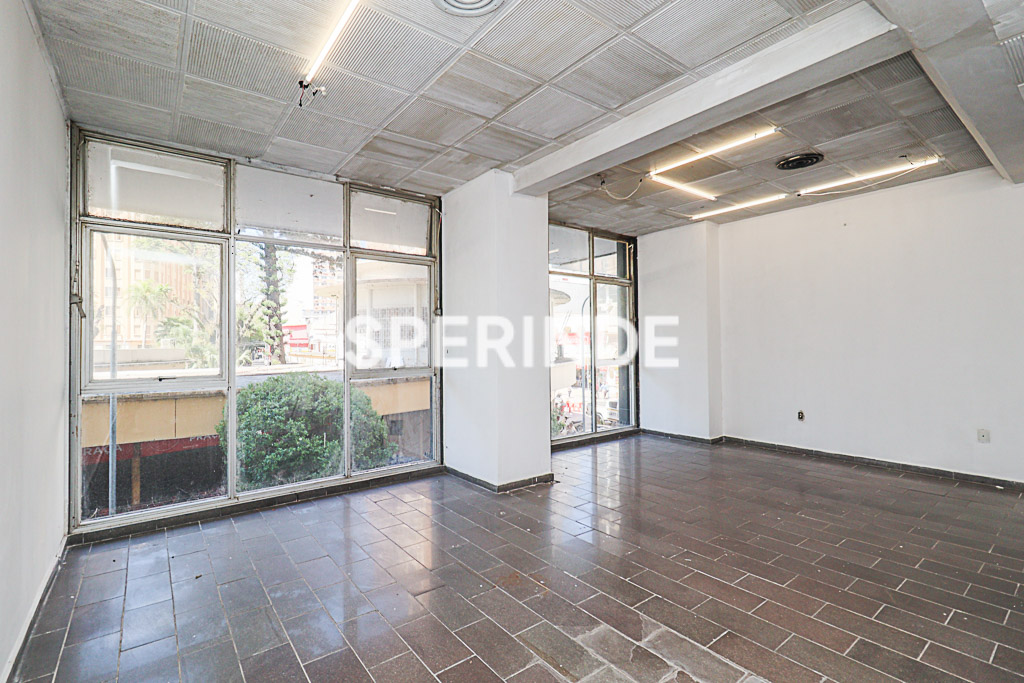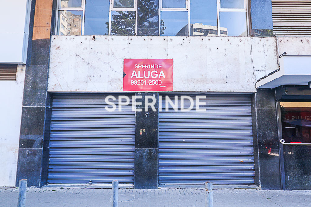 A fachada conta com vidraças e cortinas de ferro, oferecendo segurança e visibilidade para o espaço. O imóvel está localizado em região central de Porto Alegre, com fácil acesso a serviços, comércio e transporte público.