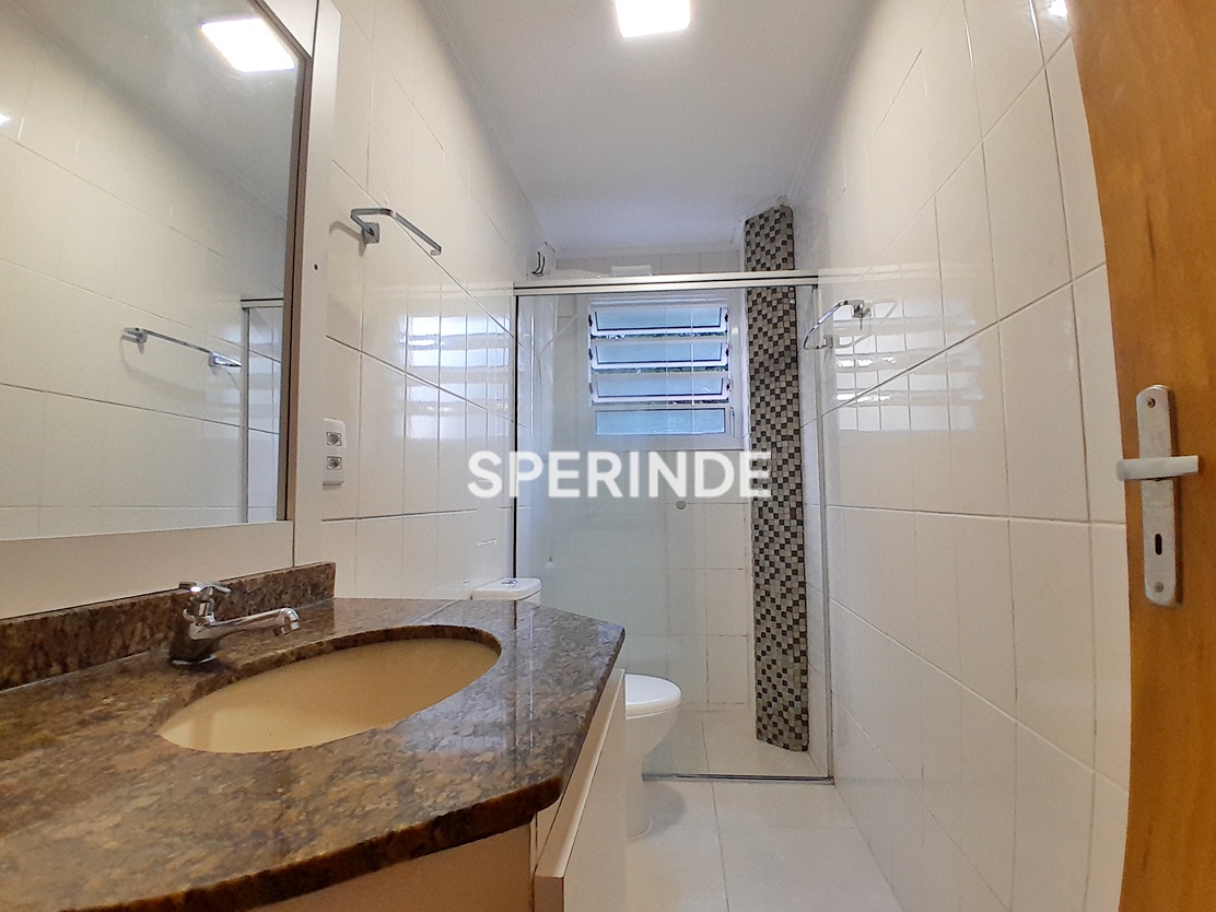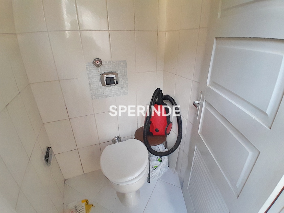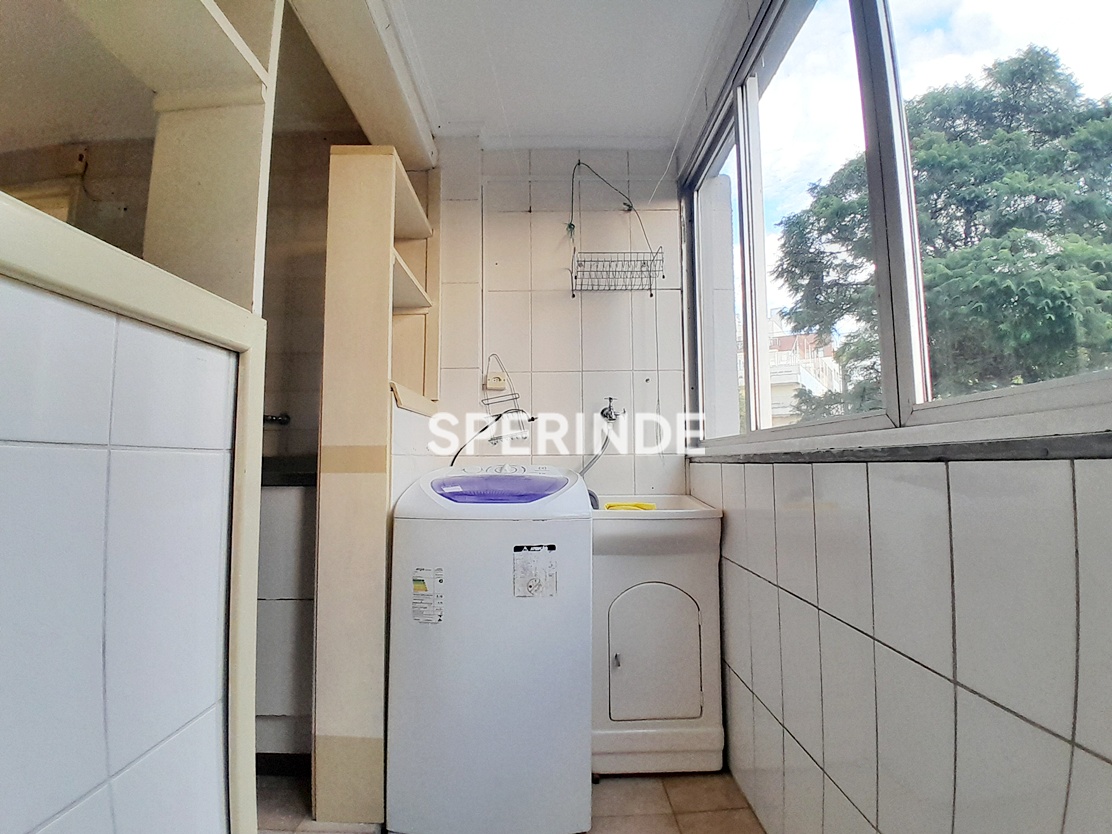 A cozinha dispõe de armários e geladeira, enquanto a área de serviço conta com máquina de lavar. Banheiro social com box de vidro. Edifício com portaria e elevadores, proporcionando controle de acesso e circulação interna.