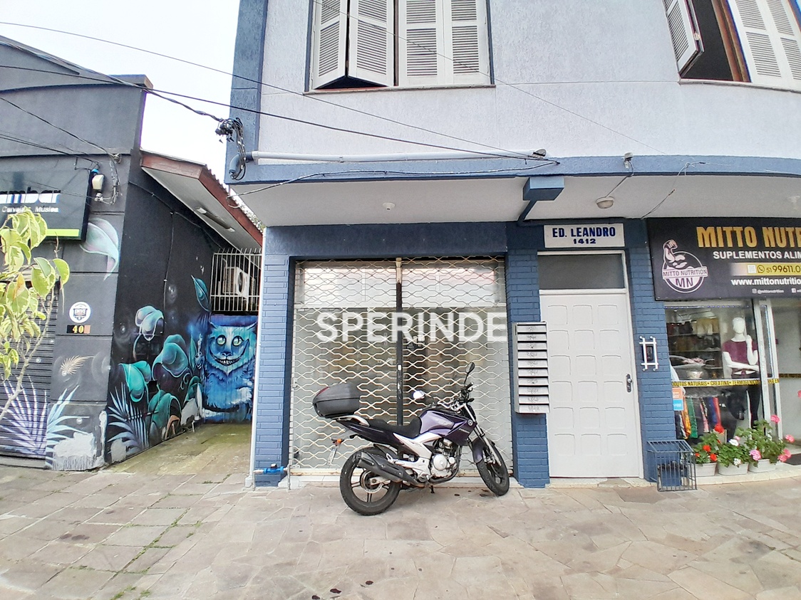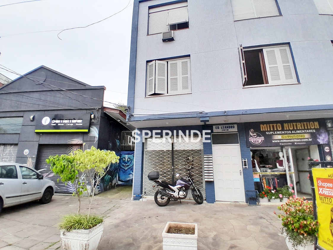 A fachada conta com porta de vidro e cortina de ferro vazada, proporcionando segurança e visibilidade para o espaço. A localização no bairro Passo D'Areia oferece acesso direto a serviços e fluxo constante de circulação.