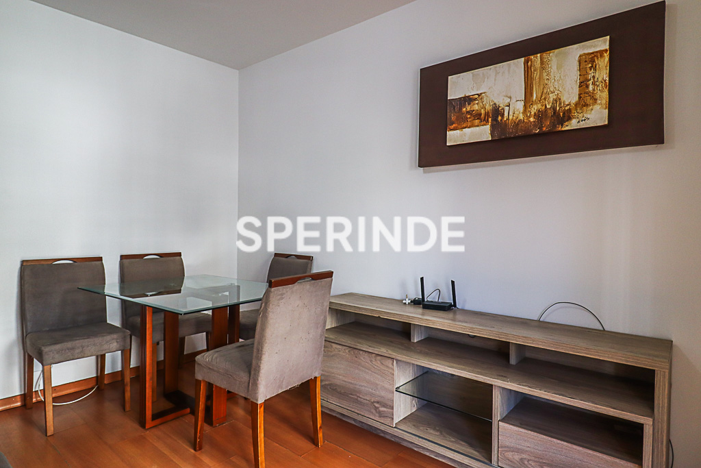 A sala conta com mesa, cadeiras, sofá e rack. A cozinha possui armários sob medida, fogão, geladeira e micro-ondas. O dormitório dispõe de roupeiro, e o banheiro conta com box de acrílico. O prédio é simples e não possui elevador.