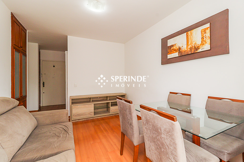 A sala conta com mesa, cadeiras, sofá e rack. A cozinha possui armários sob medida, fogão, geladeira e micro-ondas. O dormitório dispõe de roupeiro, e o banheiro conta com box de acrílico. O prédio é simples e não possui elevador.