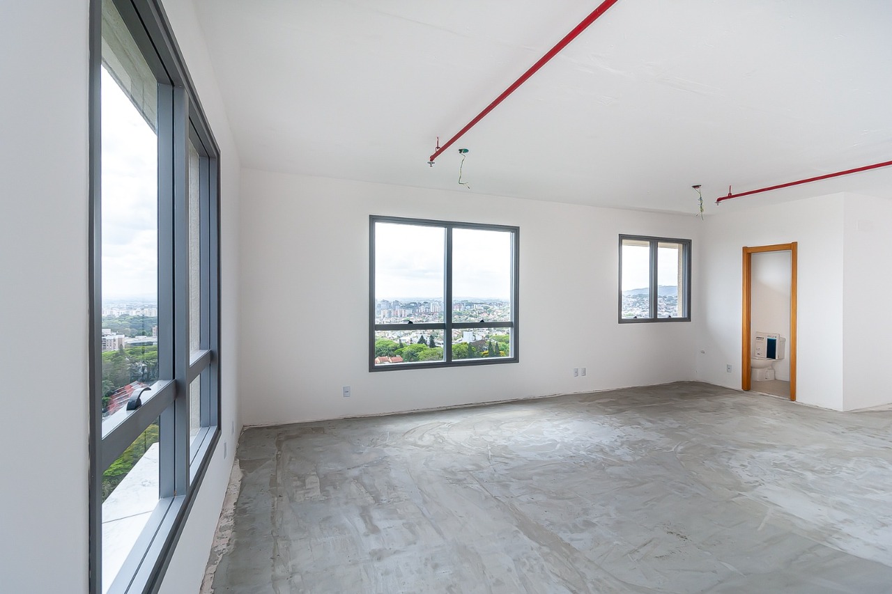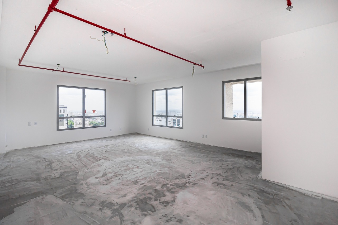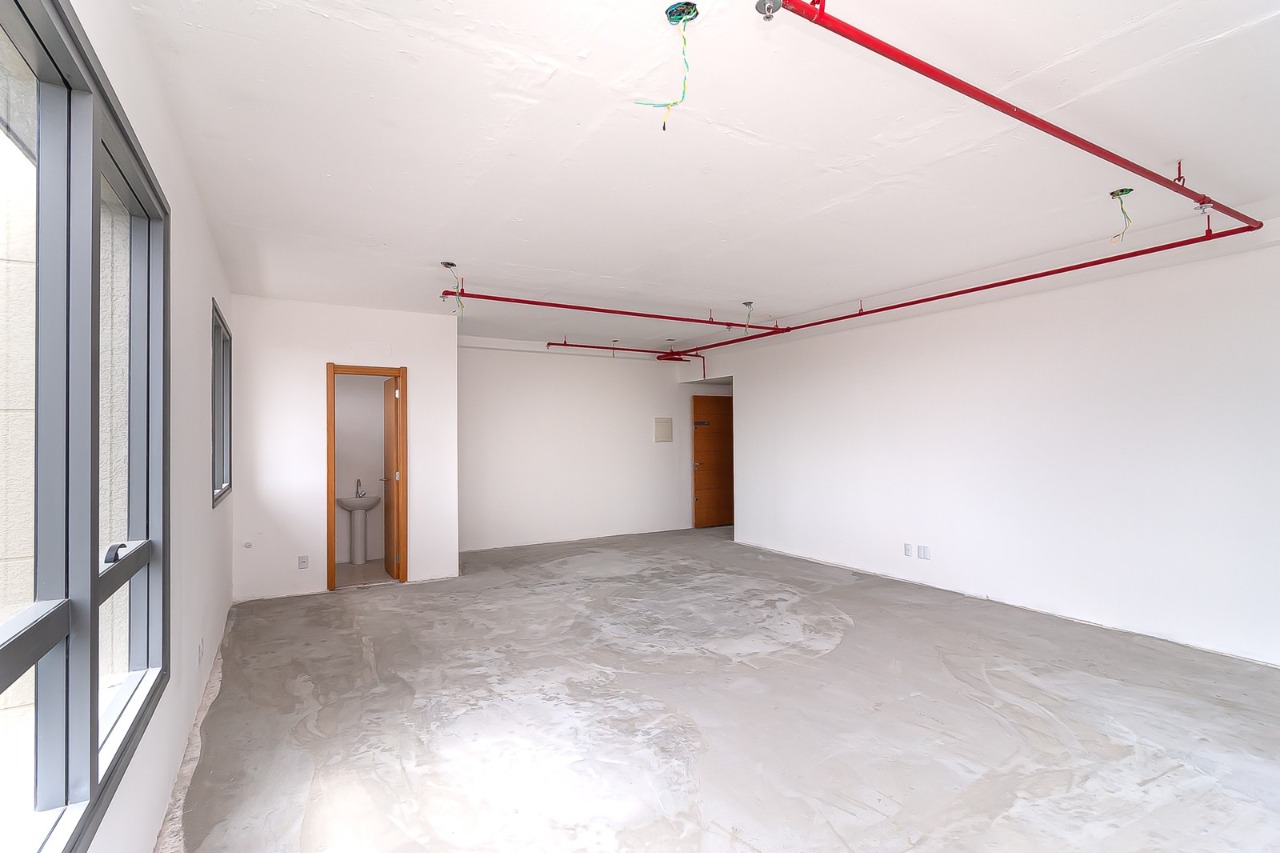 Excelente sala com 58m2 de área privativa, piso concreto, 01 banheiro, amplas janelas que permitem excelente vista e ótima iluminação, um box de garagem no edifício.
