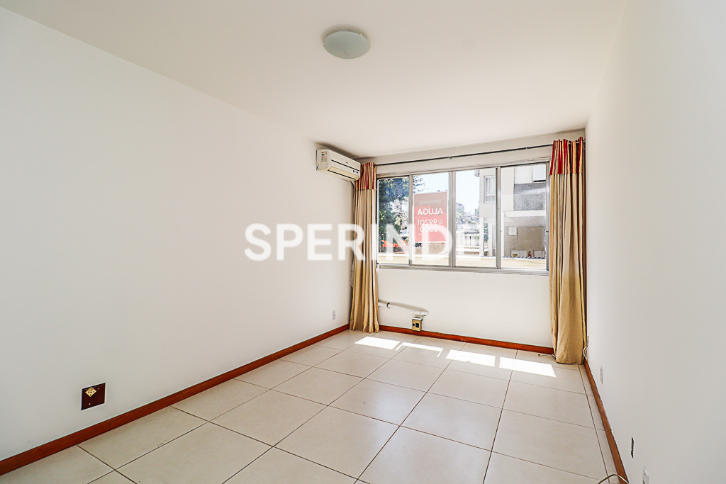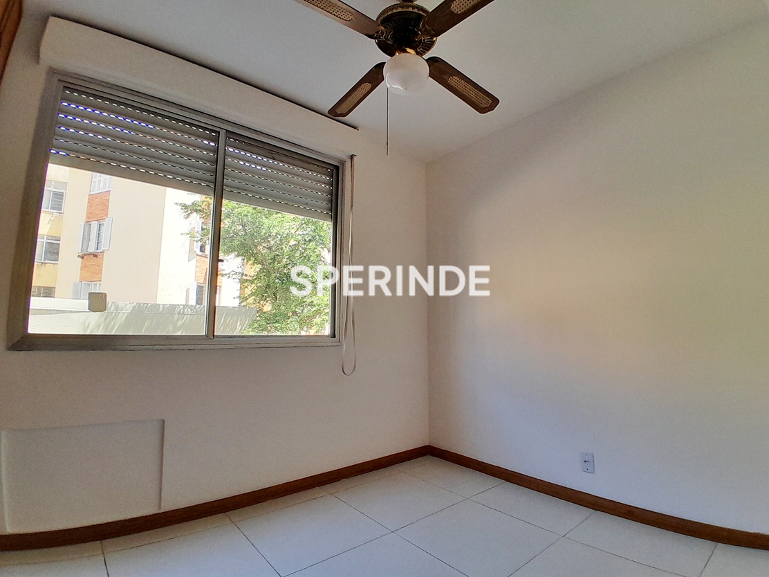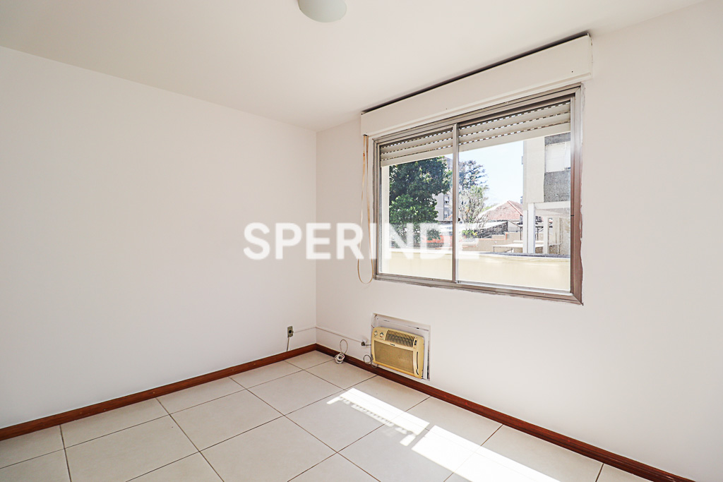 Apartamento no bairro Mont'Serrat, em Porto Alegre, composto de 2 dormitórios, sala, banheiro social, cozinha conjugada com área de serviço e dependência com lavabo. O imóvel possui piso em cerâmica e sala equipada com ar-split. Um dos dormitórios conta com ventilador de teto e roupeiro, enquanto o dormitório maior também dispõe de roupeiro.