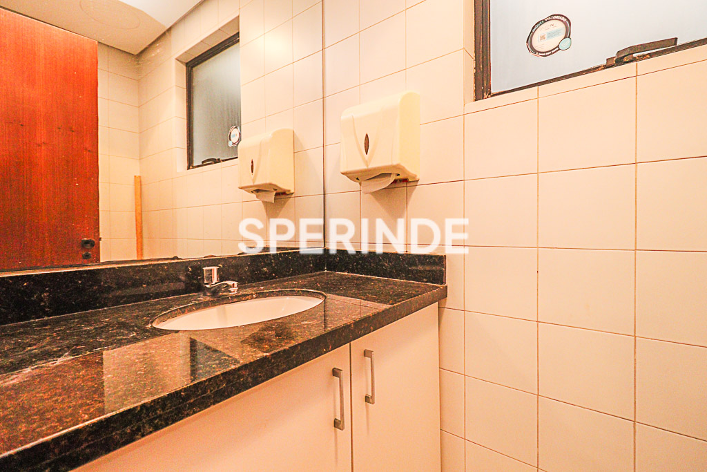 Duas das salas contam com cortinas tipo persianas, e o banheiro social dispõe de balcão e espelho. O imóvel está situado em prédio comercial com portaria e elevador, oferecendo estrutura adequada para atividades profissionais e comerciais.