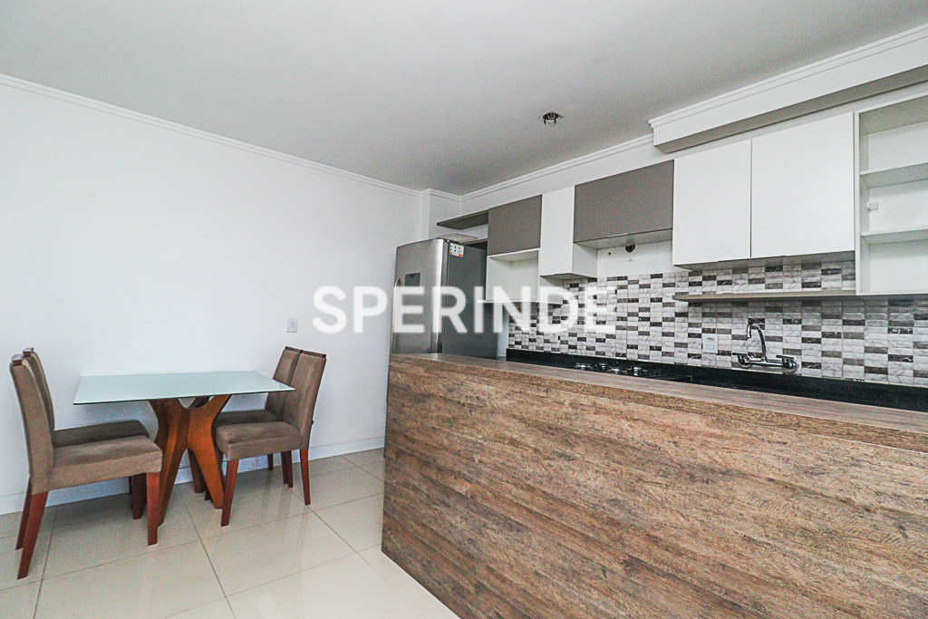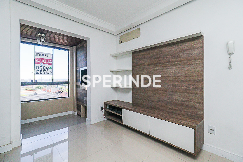 Apartamento mobiliado para alugar no bairro Cristo Redentor em Porto Alegre, com 40m² de área privativa, 1 quarto com armário, cama, living 2 ambientes com painel, mesa com cadeiras, e churrasqueira fechada, cozinha americana equipada com armários, pia, cooktop e geladeira, banheiro social com box de vidro e armário, todo em porcelanato, frente, posição solar norte e 1 vaga de garagem coberta.