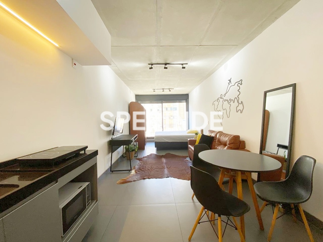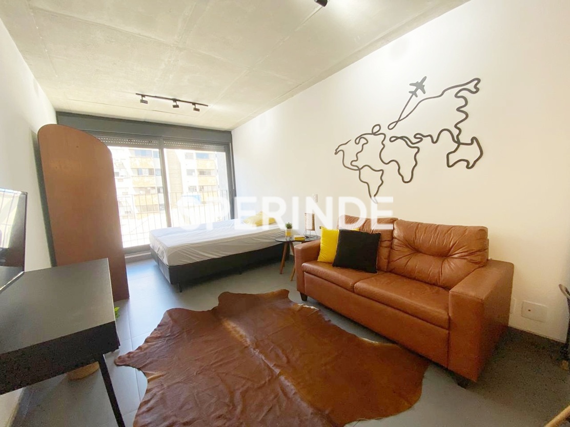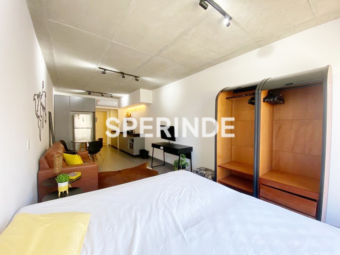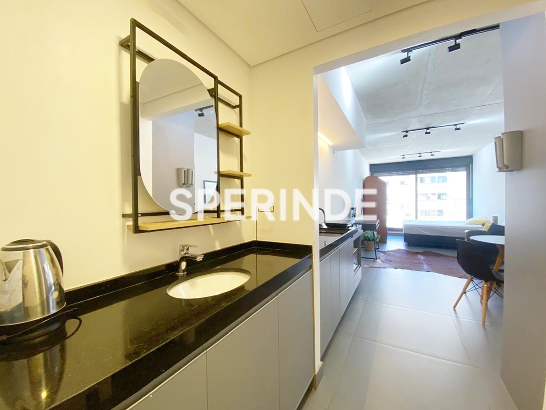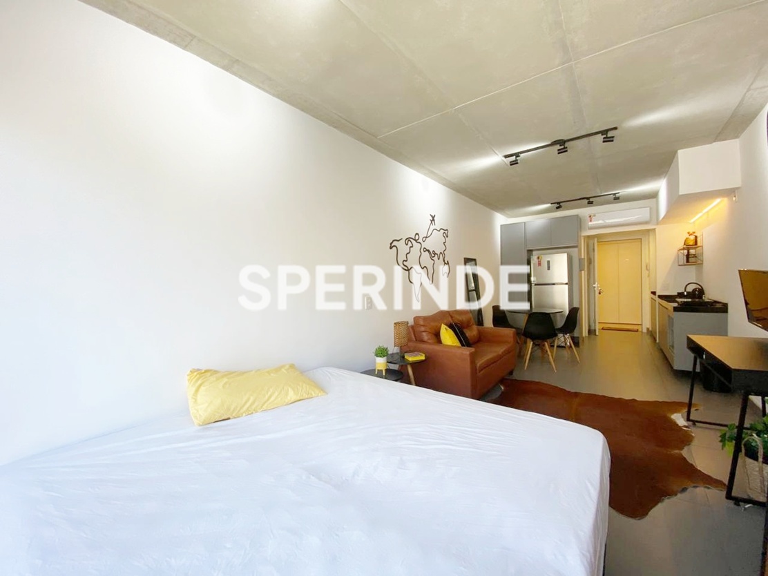 Studio mobiliado para alugar na Avenida Venâncio Aires, no bairro Cidade Baixa em Porto Alegre. O imóvel possui 34m² de área privativa, com ambiente integrado de estilo industrial, cama de casal box, armário planejado, home office, sofá, cozinha equipada armários, geladeira, cooktop de indução, micro-ondas, pia gourmet. Conta ainda com banheiro com box de vidro, sacada com vista e 1 vaga de garagem coberta e escriturada.