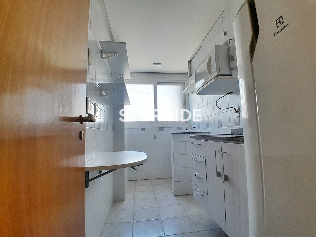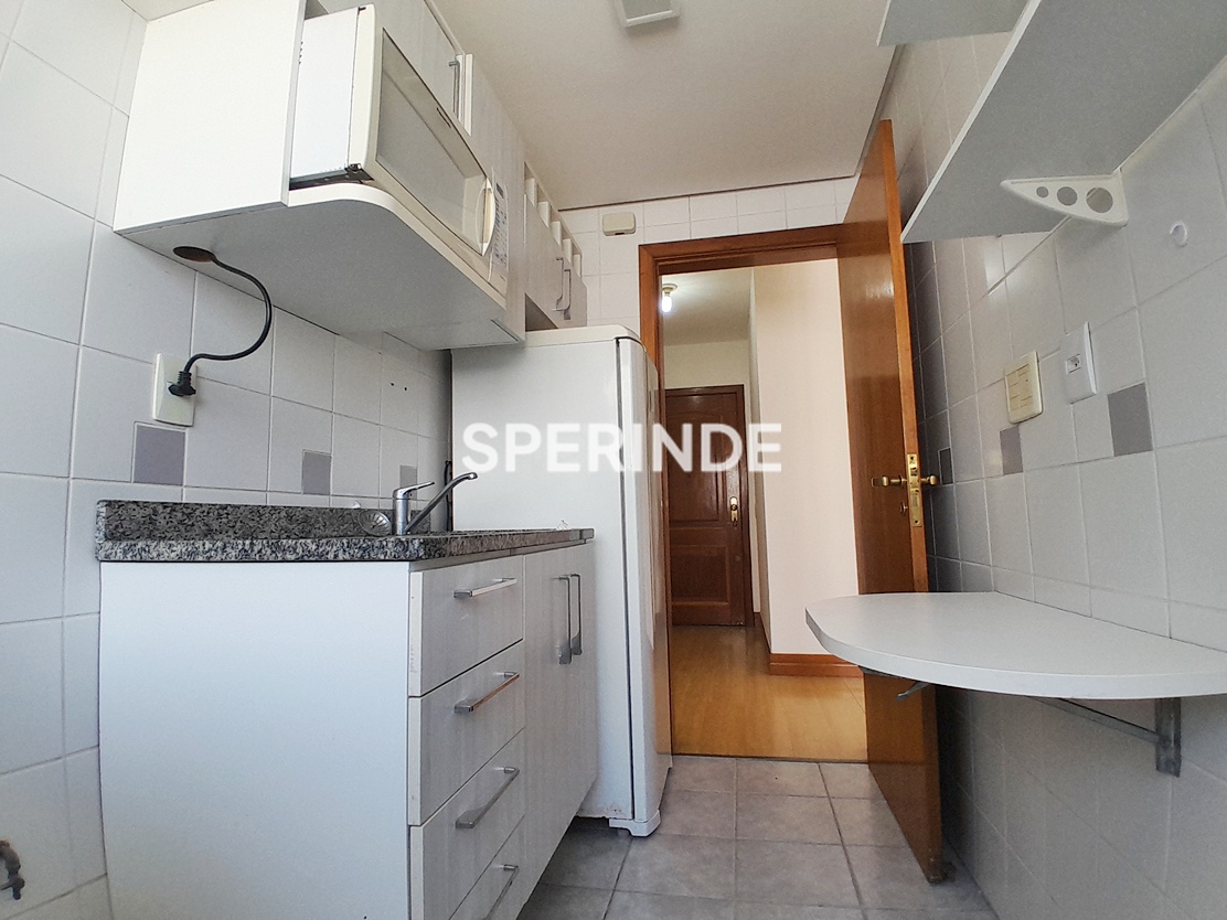 A cozinha conta com armários sob medida, geladeira e micro-ondas. A sala dispõe de cortinas tipo persianas de rolo e o dormitório possui roupeiro, bancada com painel e nichos. O banheiro é equipado com box de vidro. O imóvel conta com aquecimento central de água. O prédio possui portaria e elevadores.