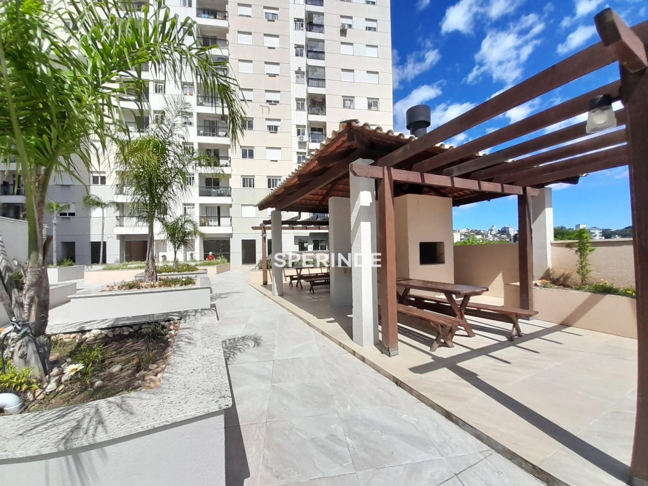 Apartamento de 60 m² no bairro Santa Catarina, em Caxias do Sul, com dois dormitórios, suíte, living integrado, cozinha, área de serviço, banheiro social e sacada. O imóvel apresenta piso laminado, orientação leste e duas vagas de garagem.