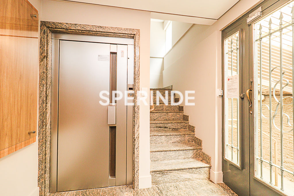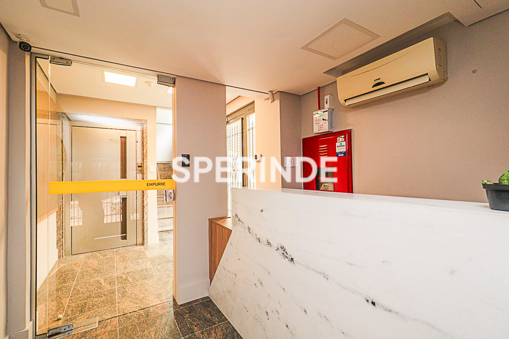 O hall conta com armário embutido, uma das salas dispõe de armários sob medida, e as salas possuem cortinas tipo persianas e tipo rolo. O banheiro social está equipado com balcão e espelho. Prédio comercial com portaria e elevador.