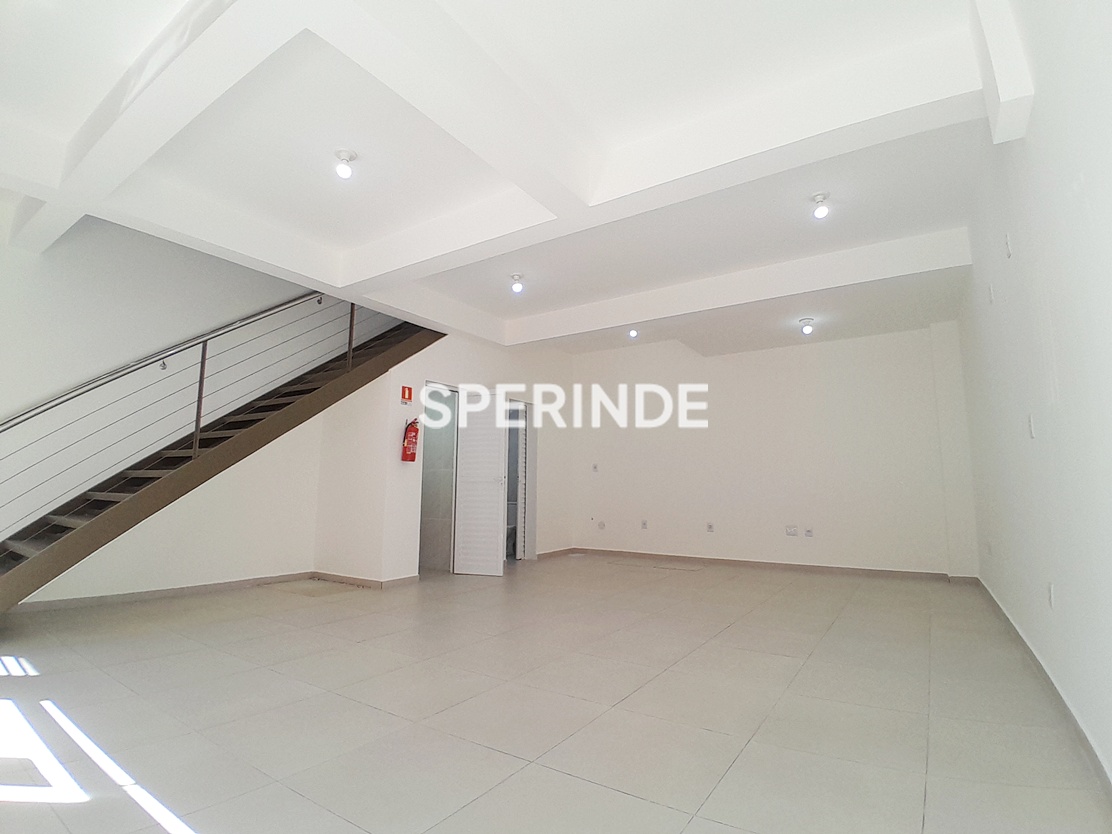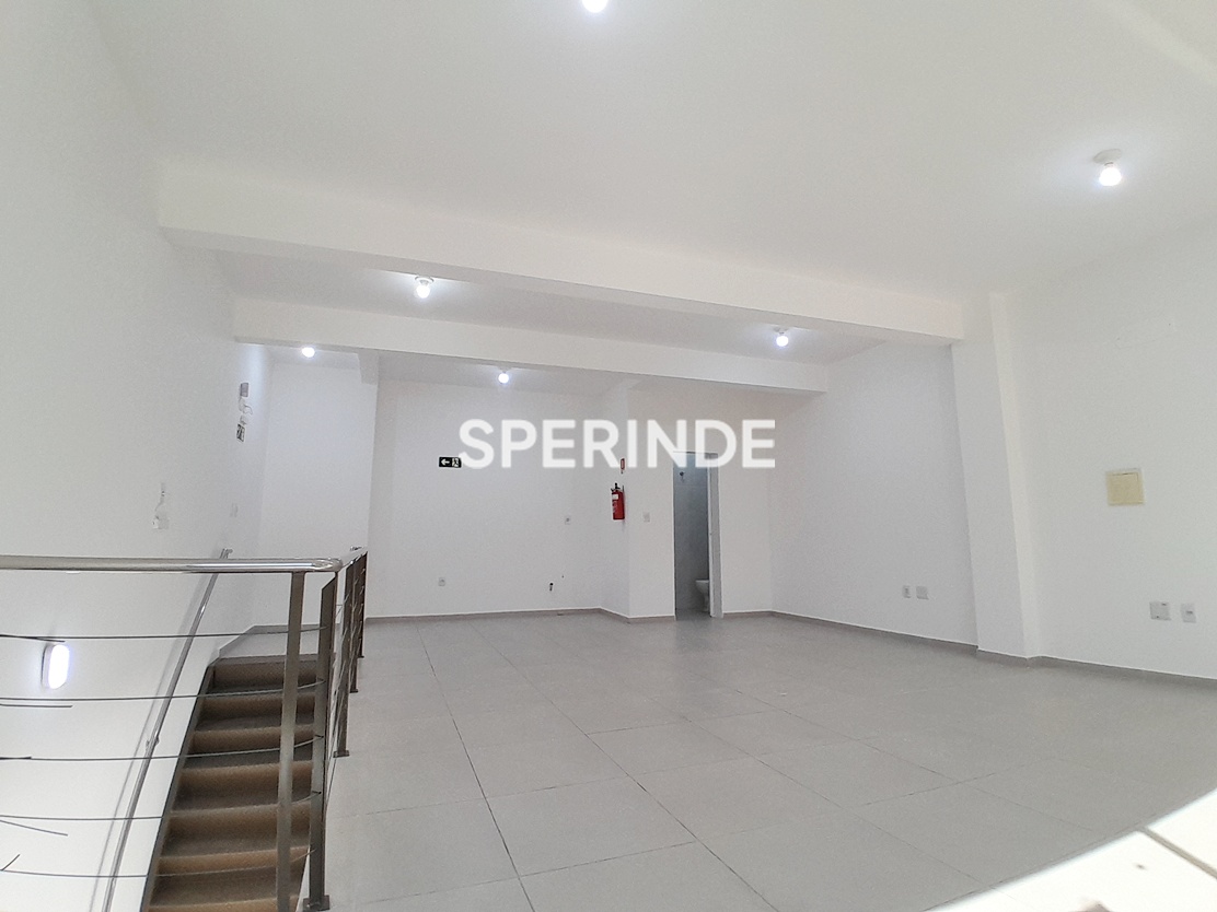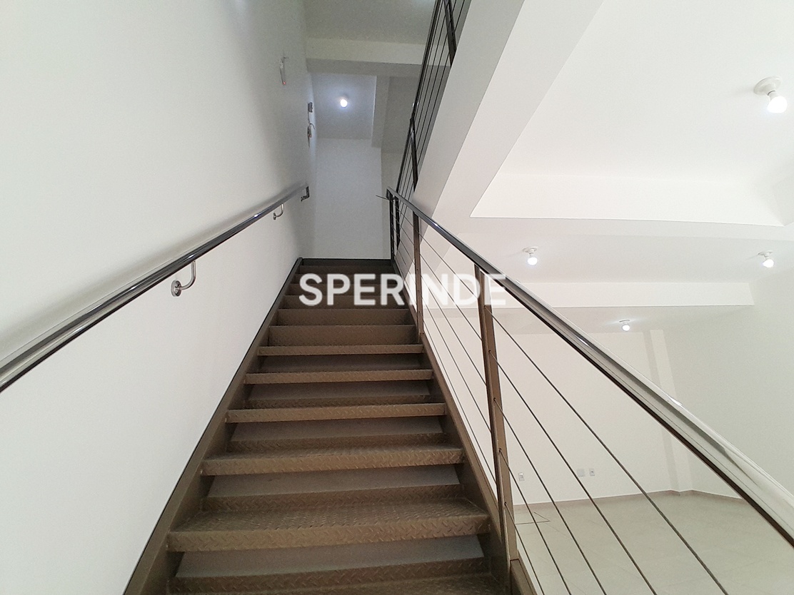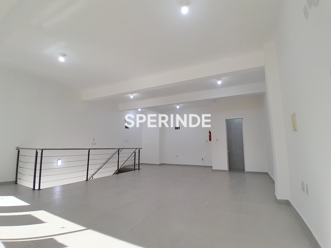 O mezanino superior é amplo, conta com janelas e banheiro social, com acesso por escada de ferro. A configuração atende atividades comerciais que necessitam de área distribuída em dois níveis.