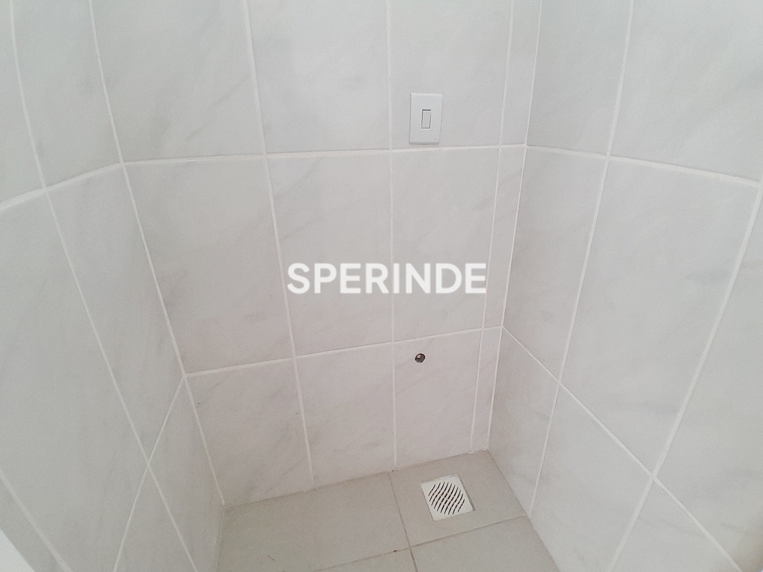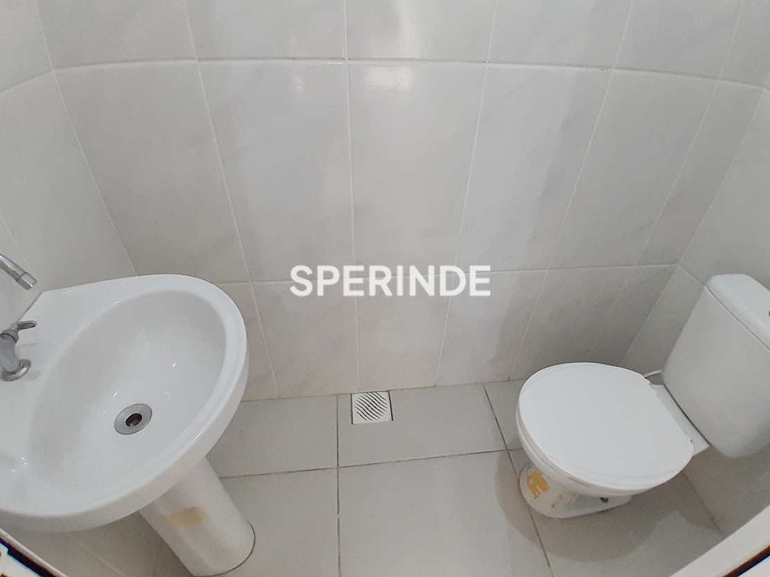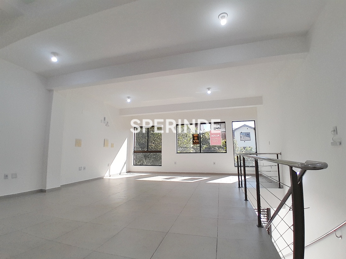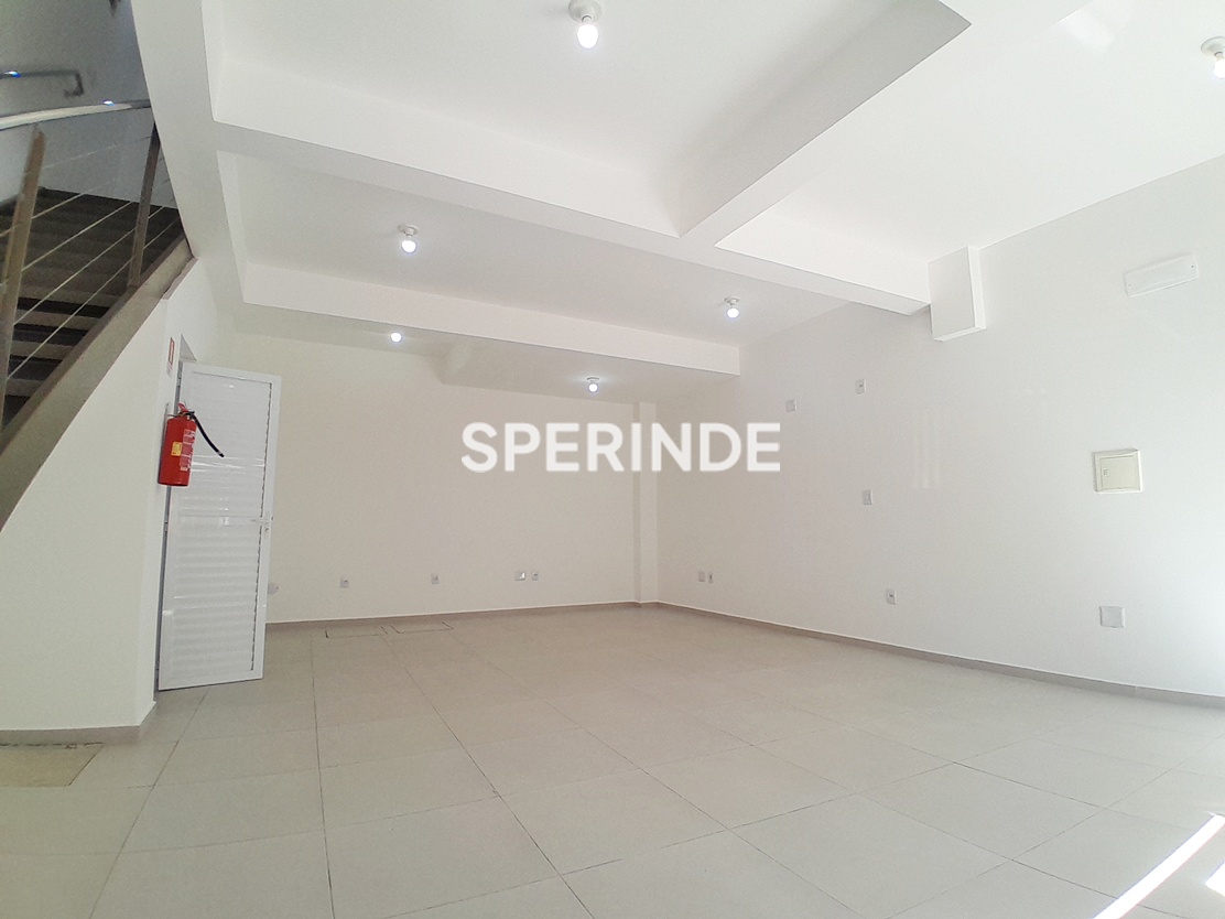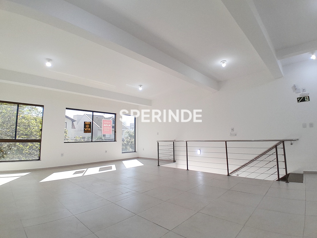 O mezanino superior é amplo, conta com janelas e banheiro social, com acesso por escada de ferro. A configuração atende atividades comerciais que necessitam de área distribuída em dois níveis.