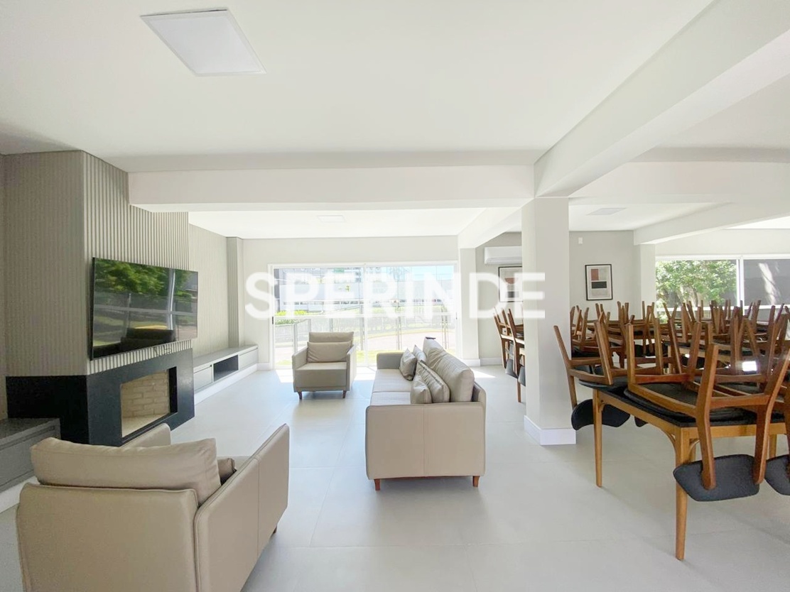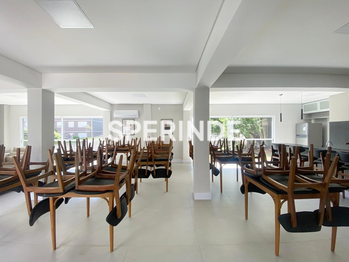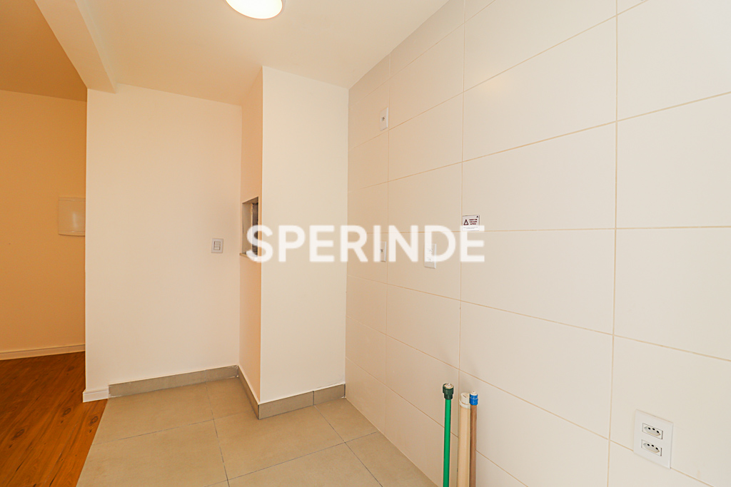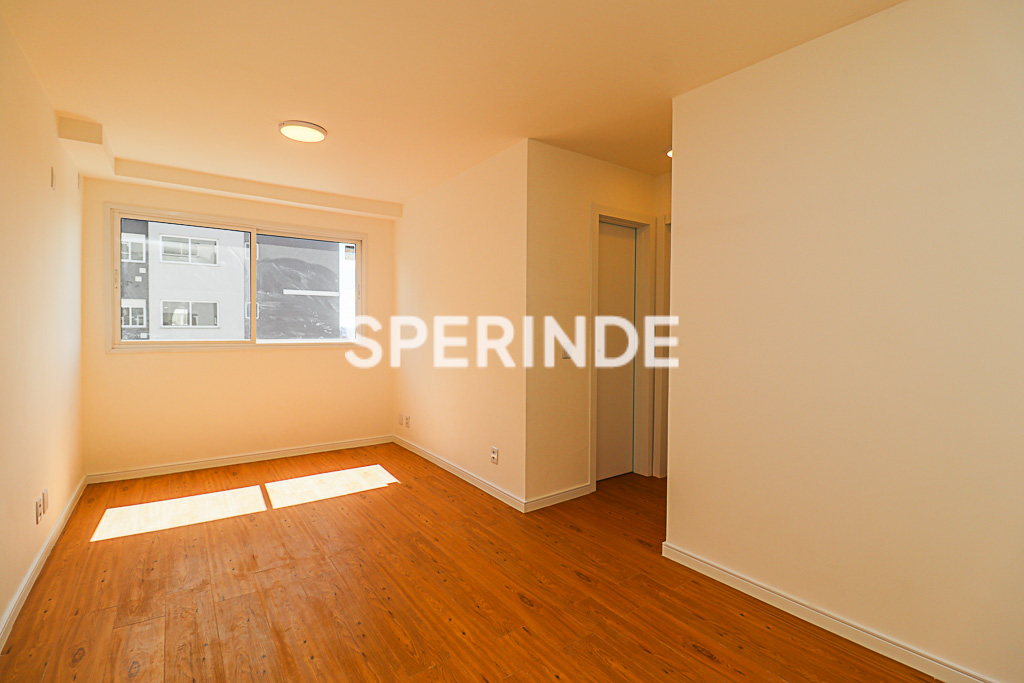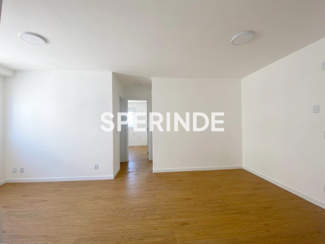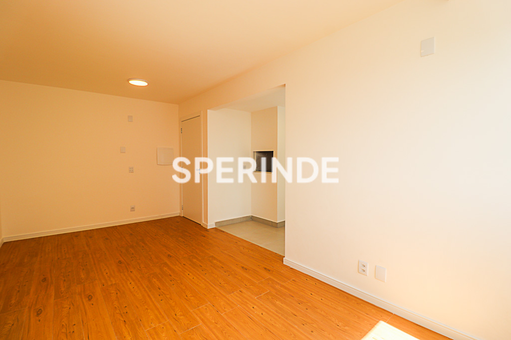 Apartamento com 59m² de área privativa, composto por living com dois ambientes, banheiro social, cozinha com churrasqueira e área de serviço integrada. O imóvel é lateral, bem iluminado, com piso laminado e porcelanato, oferecendo boa distribuição dos espaços e funcionalidade no dia a dia.