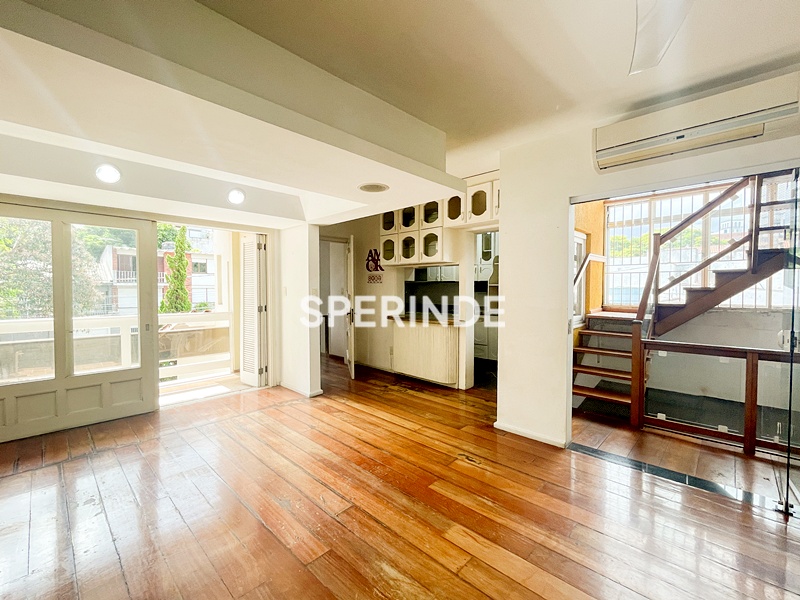 Apartamento duplex para alugar no bairro Petrópolis, em Porto Alegre, com 180m² de área privativa. O imóvel conta com living para dois ambientes, com lareira, ar-condicionado split e acesso à sacada, proporcionando conforto e integração dos espaços. A cozinha é equipada com pia, armários e cooktop, oferecendo praticidade no dia a dia.