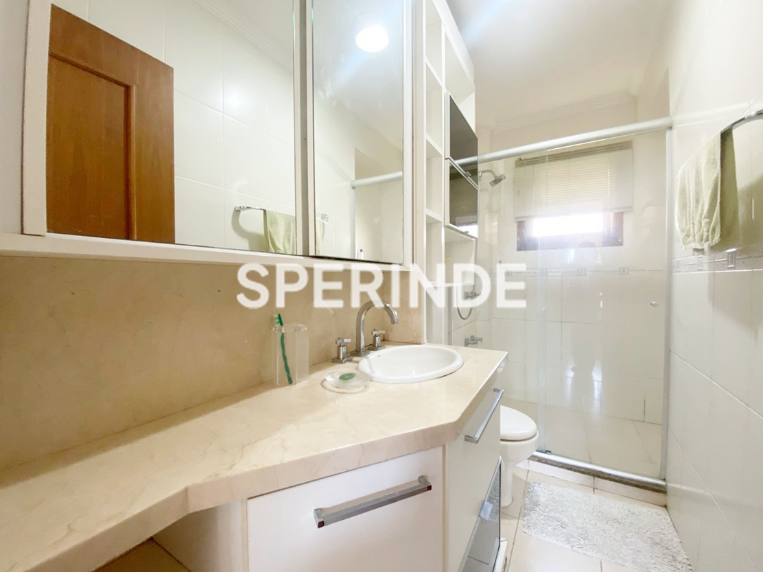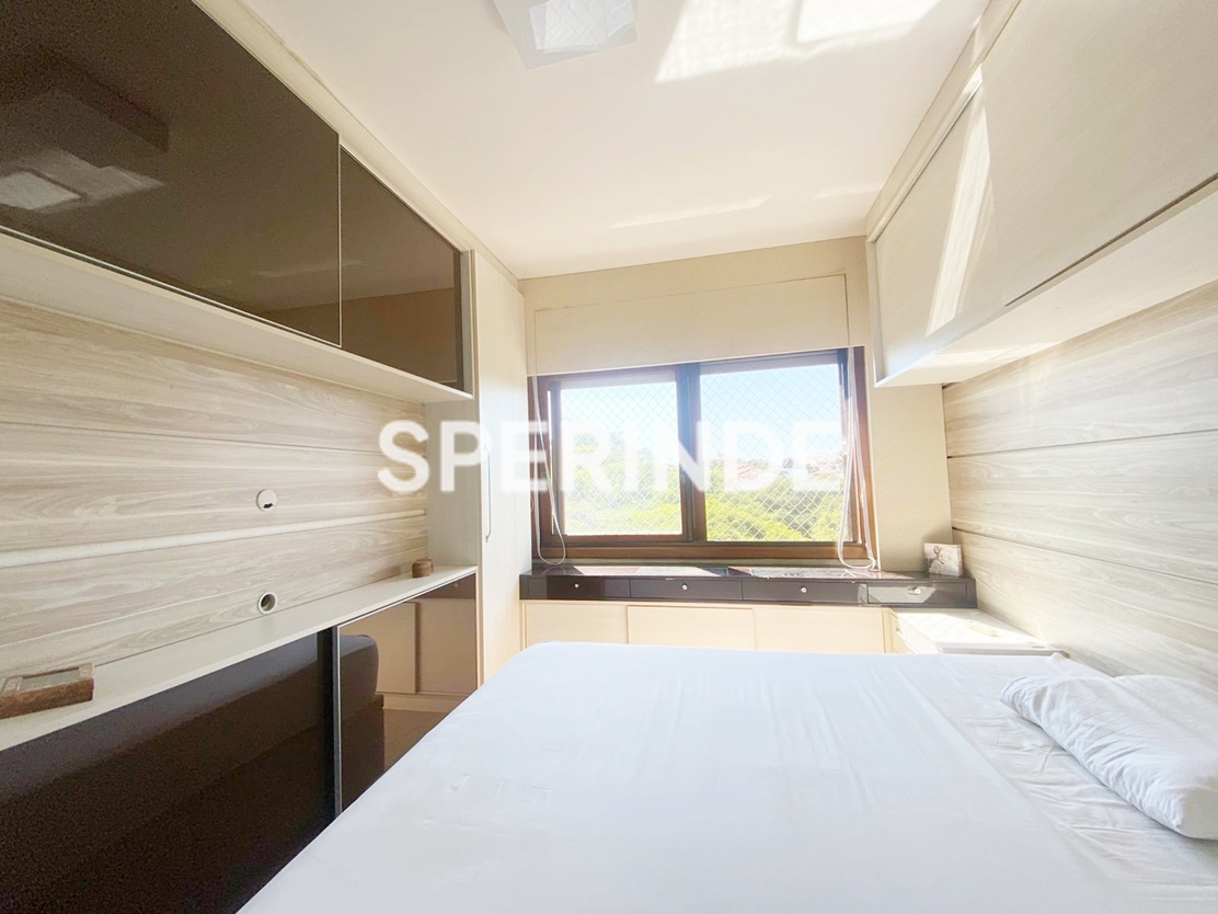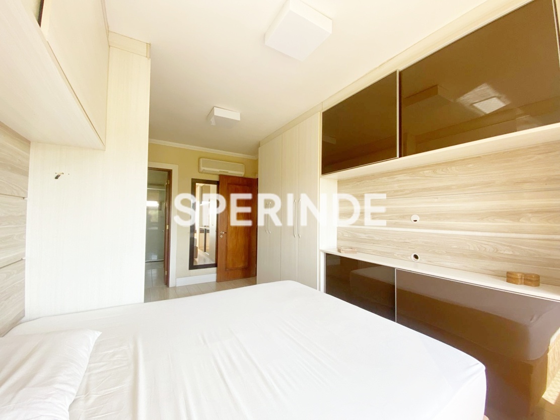 Apartamento completamente mobiliado com 125m² de área total, composto por 3 quartos, sendo 1 suíte, living para dois ambientes com churrasqueira e pia de apoio, cozinha planejada e equipada e área de serviço separada. O terceiro quarto está configurado como gabinete. Possui marcenaria sob medida, mobiliário completo, banheiro com ventilação natural e espera para hidromassagem, além de 2 vagas de garagem individuais, cobertas, e depósito.