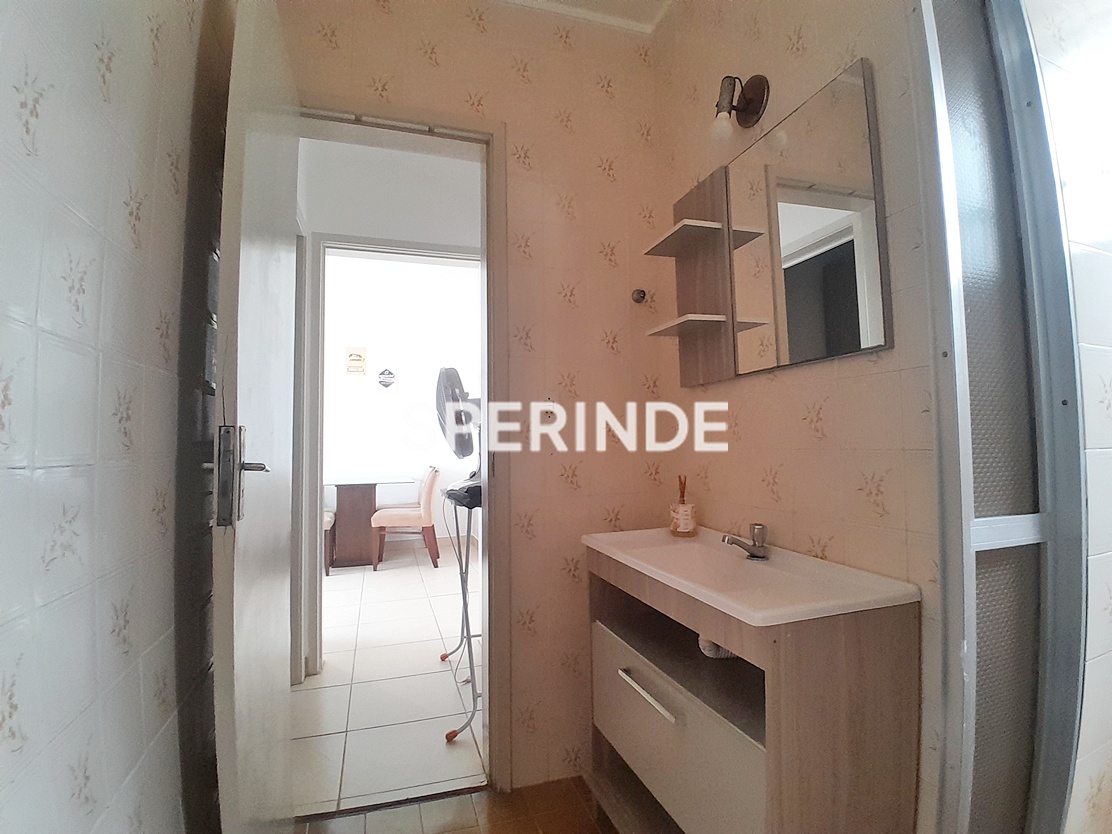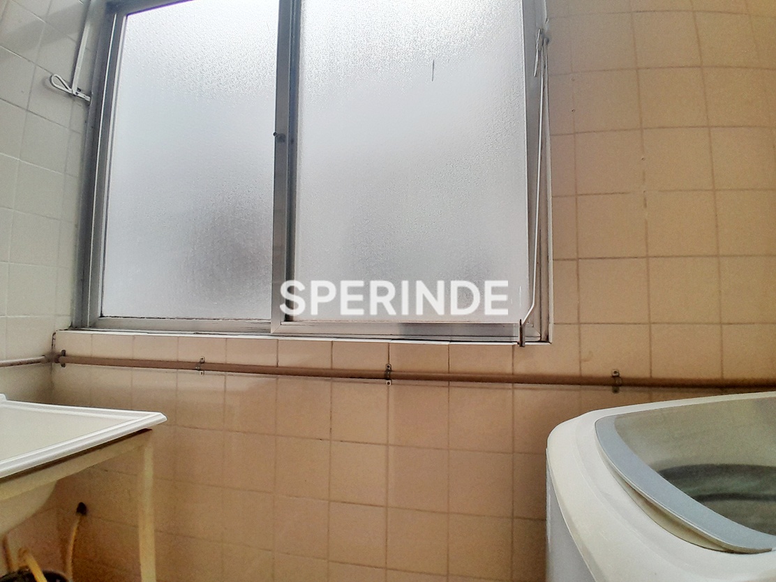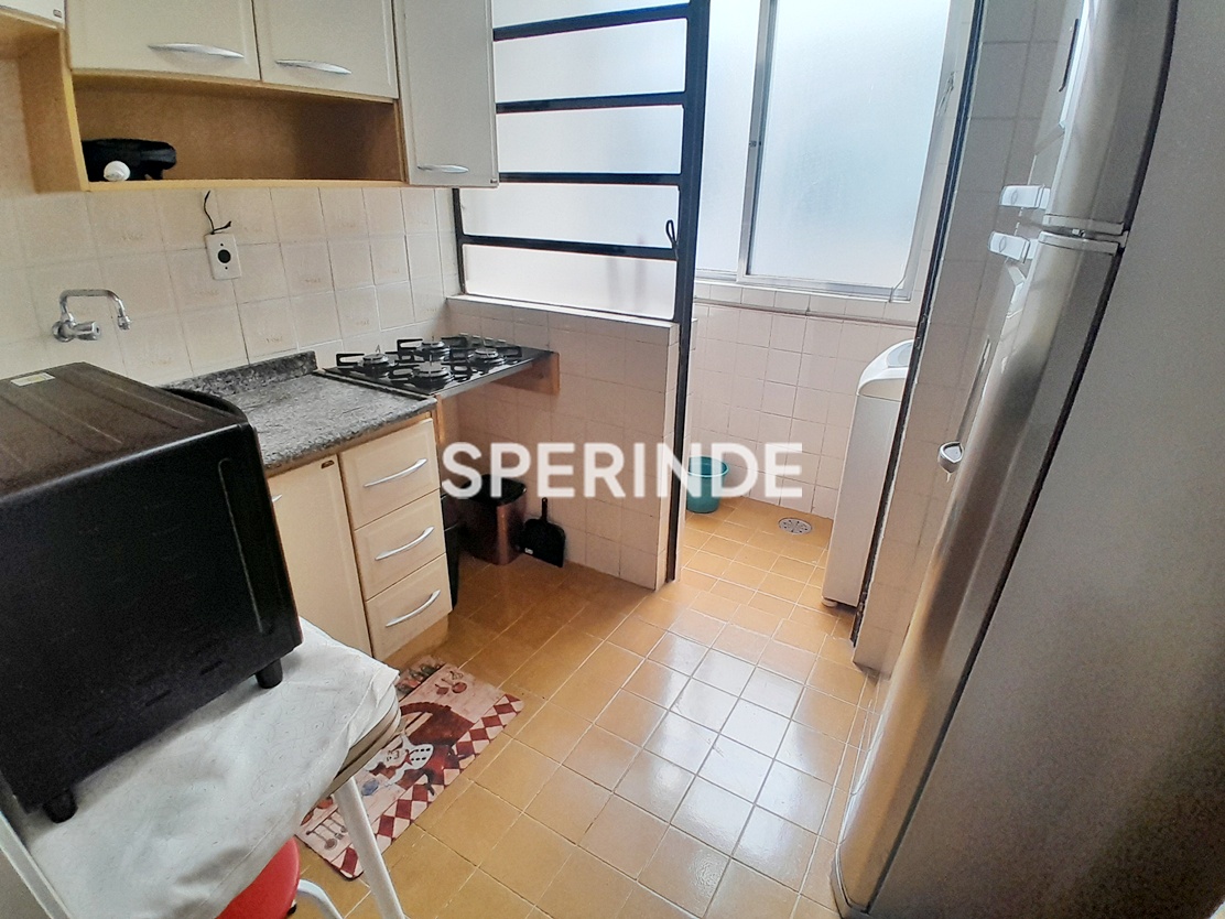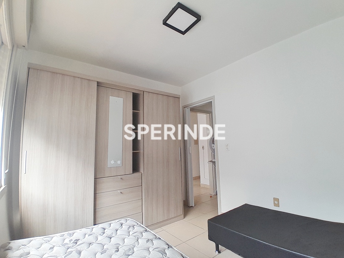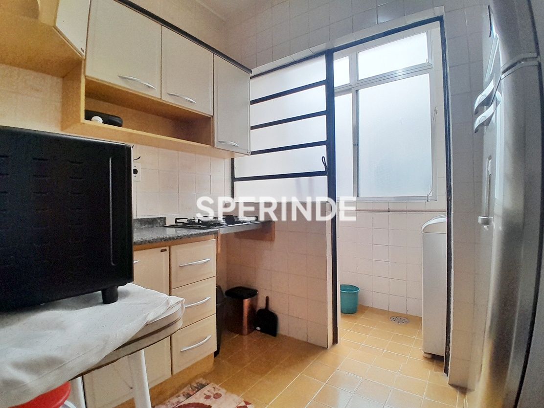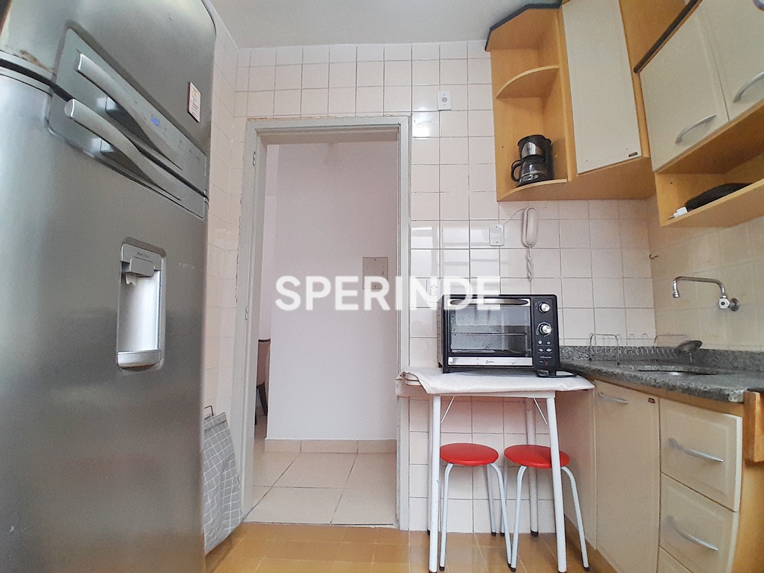A sala conta com sofá, mesa, ar split, rack, televisão e ventilador. O dormitório dispõe de cama e roupeiro. A cozinha é equipada com geladeira, fogão cooktop e armários, e a área de serviço possui máquina de lavar. Banheiro com box de acrílico e piso em cerâmica e lajota. Prédio simples, sem elevador.