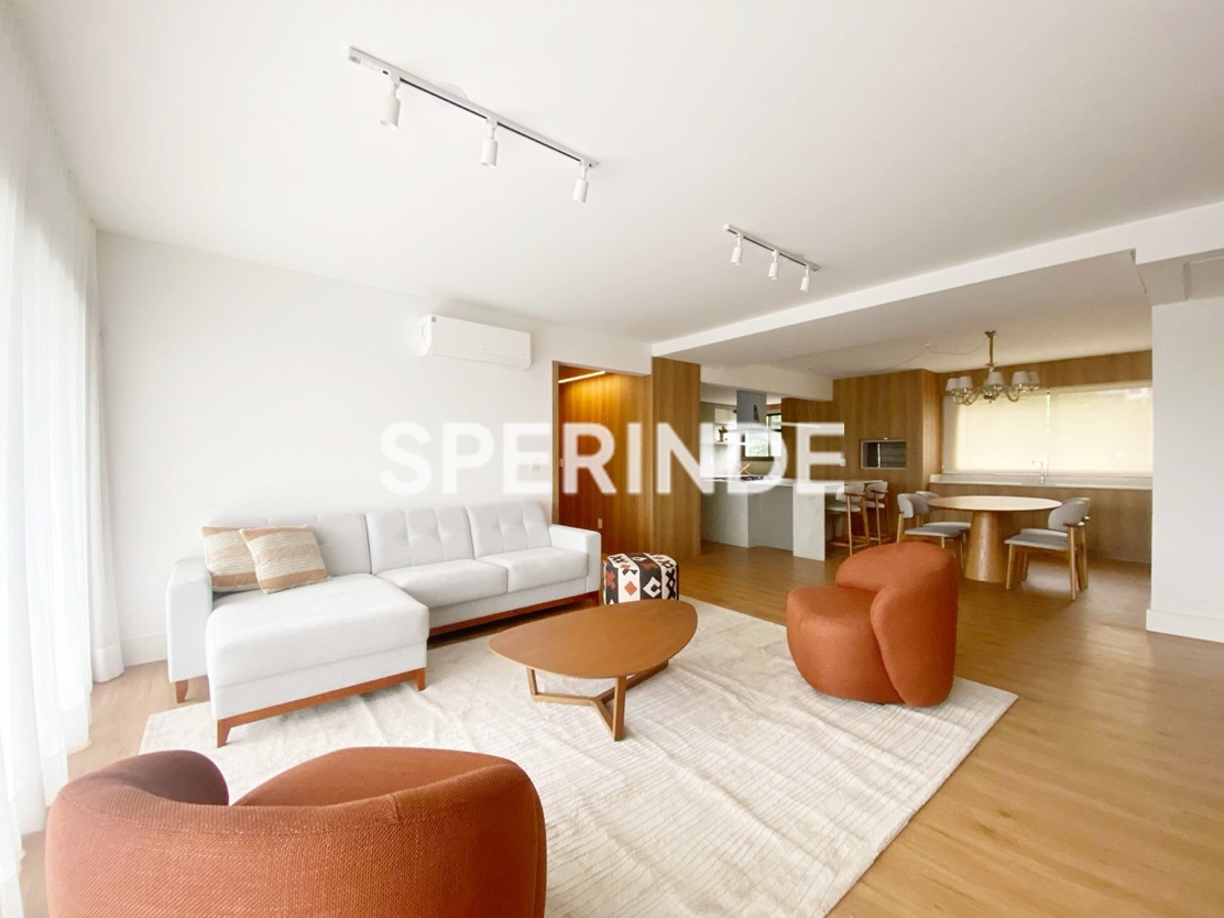 Apartamento completamente mobiliado para alugar na Rua Tajuja, no bairro Três Figueiras, em Porto Alegre. Possui 154m² de área privativa, com três suítes equipadas com armários, splits e camas box. Living amplo para dois ambientes, com lavabo, split, lareira, armários, sofá e sacada integrada ao espaço com churrasqueira e armários planejados. Cozinha planejada e área de serviço independente com armários, aquecedor e banheiro auxiliar. Conta ainda com duas vagas de garagem individuais, piso em laminado e porcelanato, e posição solar leste e norte, garantindo ótima iluminação natural.