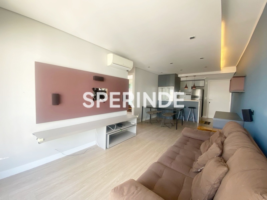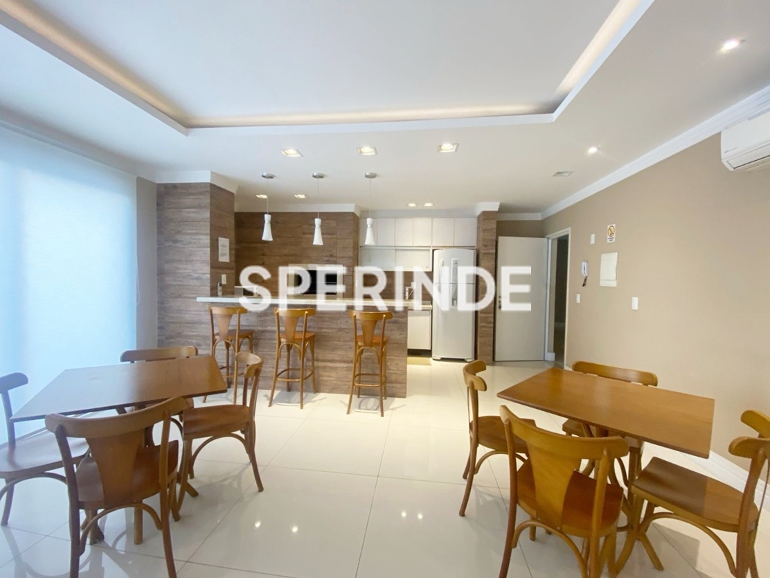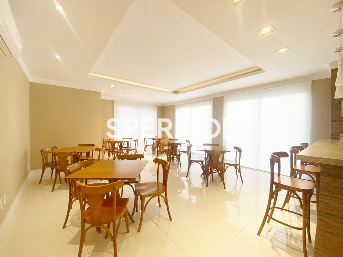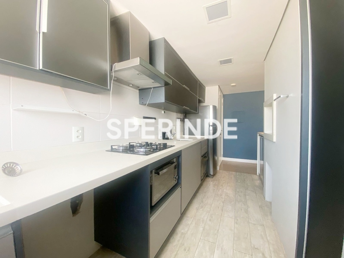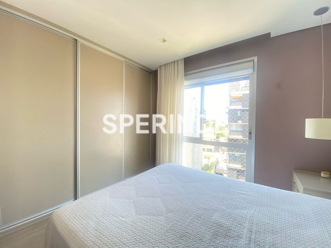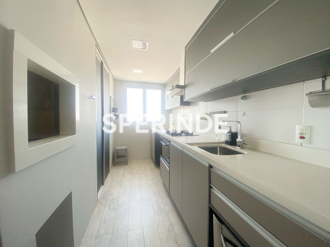Apartamento com 66m² de área privativa, composto por 2 quartos com armários, sendo 1 suíte com cama, living para dois ambientes com split, painel e mesa com cadeiras. A cozinha americana conta com armários sob medida, churrasqueira, geladeira, cooktop, depurador, micro-ondas e forno elétrico. Área de serviço separada com tanque e armário. Imóvel de frente, bem ensolarado, com posição solar leste e piso em laminado e cerâmico. Possui vaga coberta para 2 carros (dupla) e depósito.