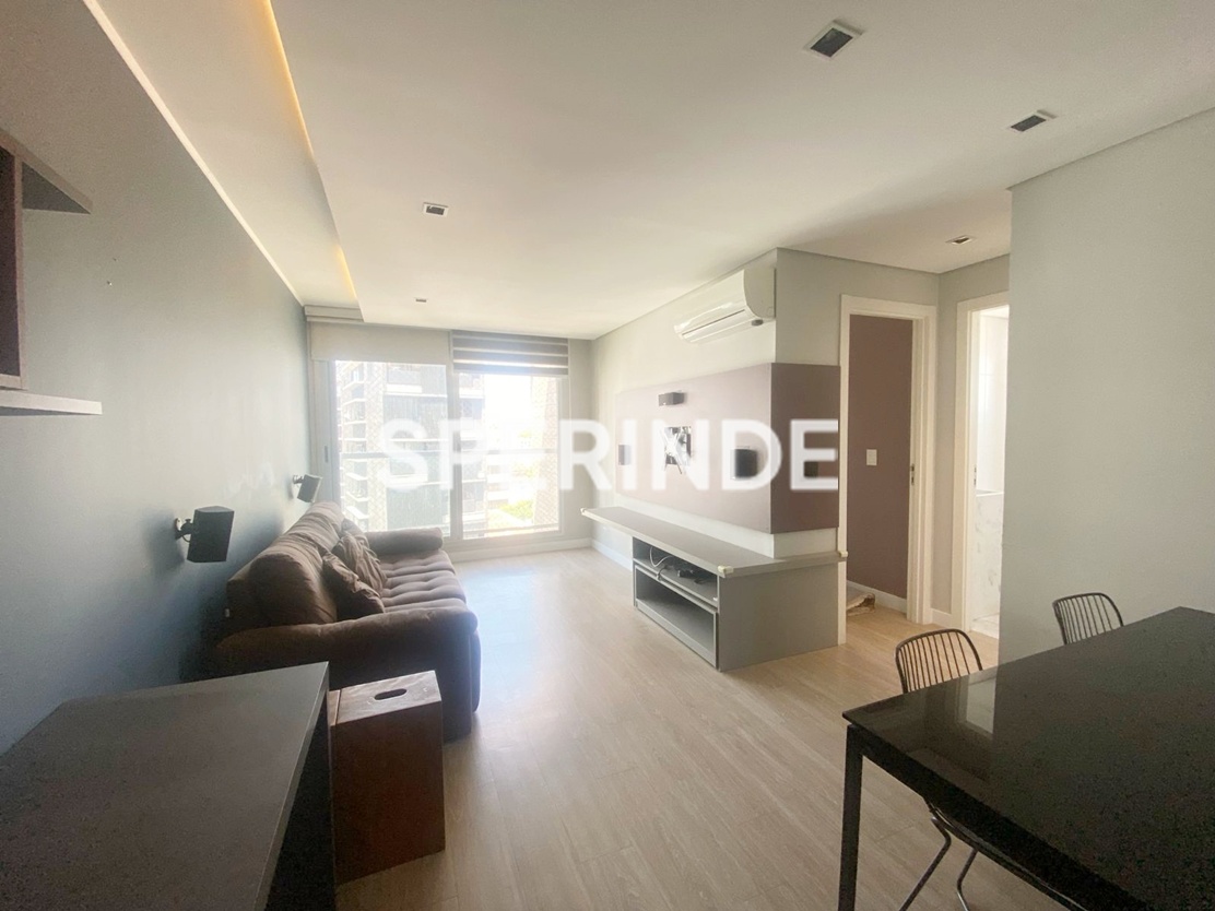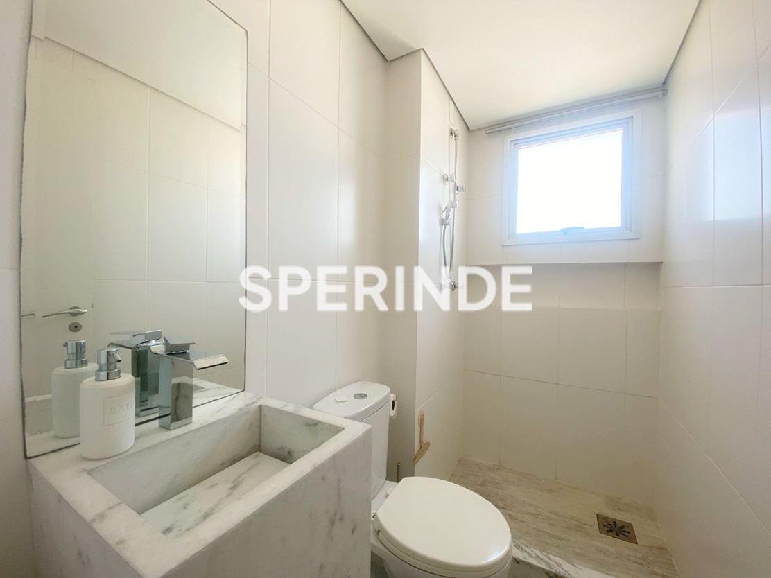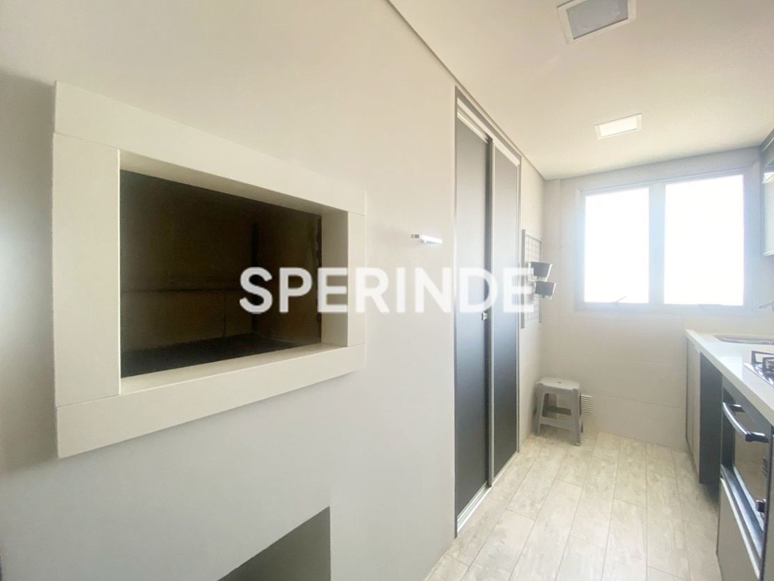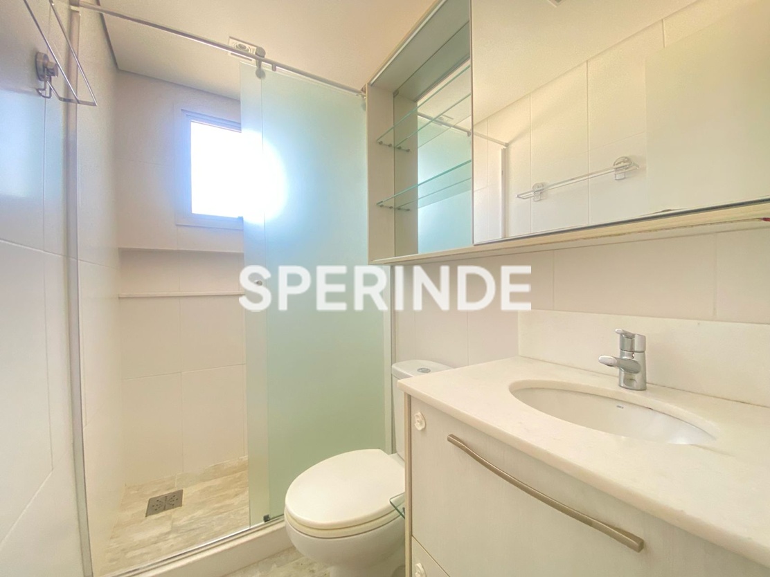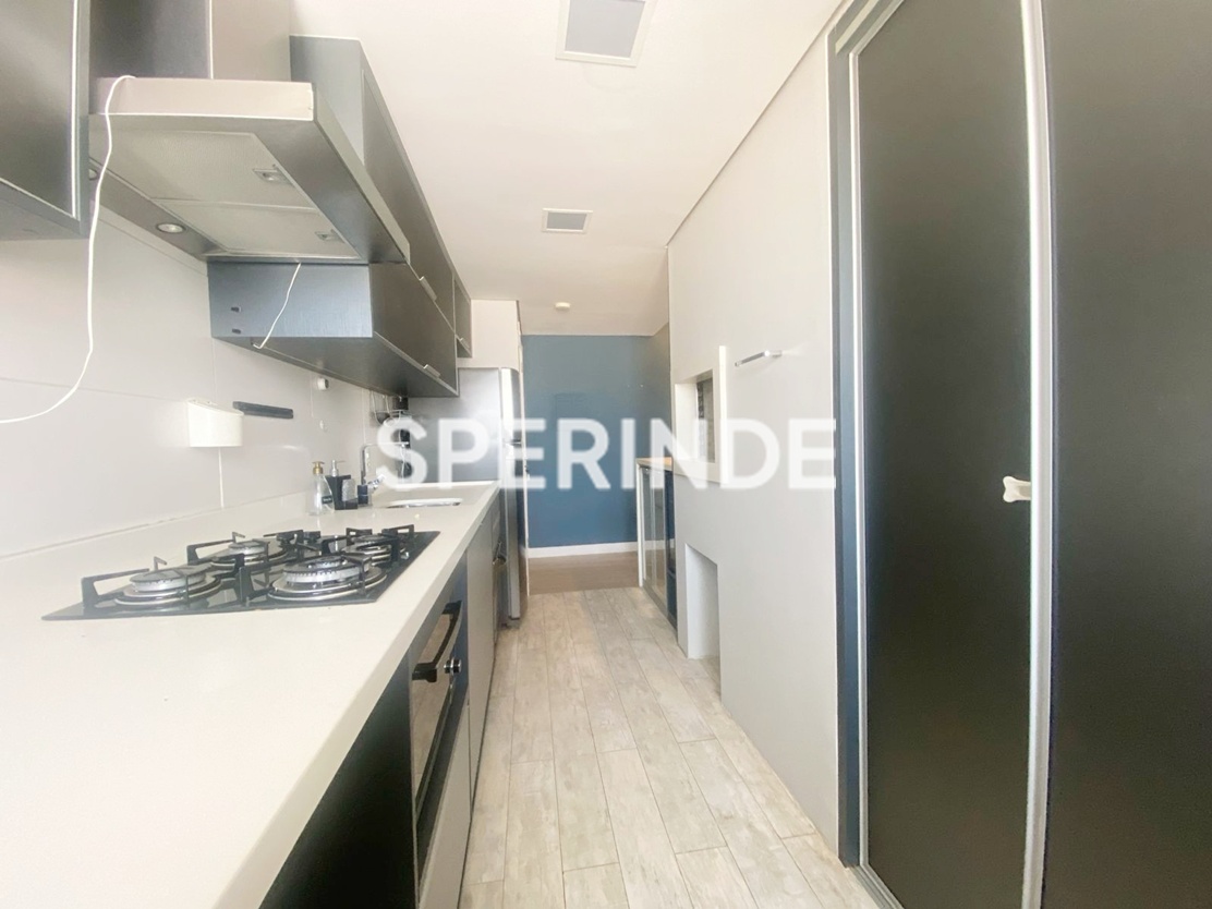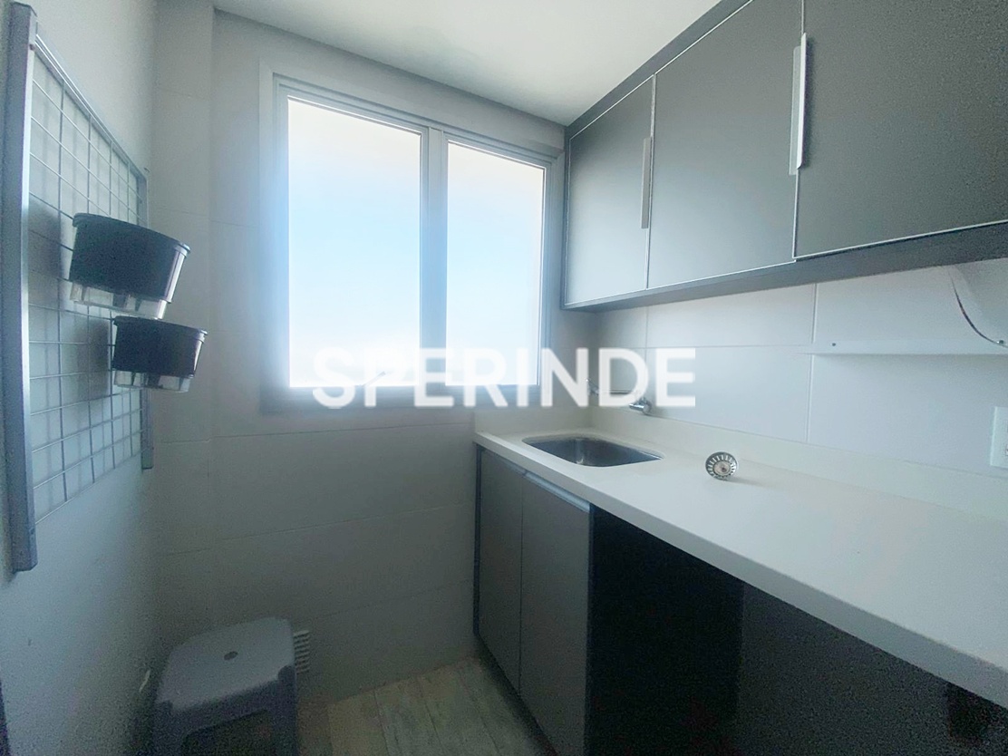 Apartamento com 66m² de área privativa, composto por 2 quartos com armários, sendo 1 suíte com cama, living para dois ambientes com split, painel e mesa com cadeiras. A cozinha americana conta com armários sob medida, churrasqueira, geladeira, cooktop, depurador, micro-ondas e forno elétrico. Área de serviço separada com tanque e armário. Imóvel de frente, bem ensolarado, com posição solar leste e piso em laminado e cerâmico. Possui vaga coberta para 2 carros (dupla) e depósito.