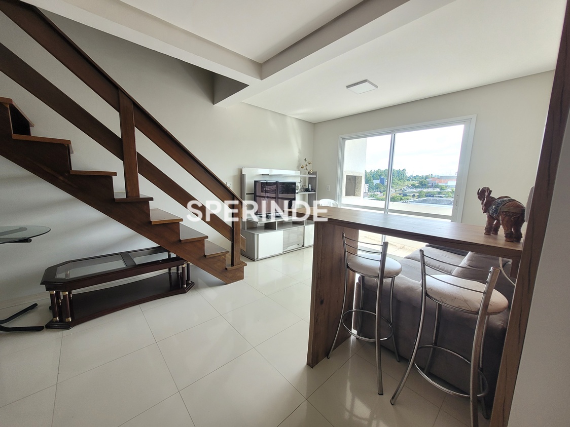 Cobertura duplex de 231 m² localizada no bairro Sagrada Família, em Caxias do Sul, com 2 dormitórios, ambos suítes. O imóvel possui cozinha, área de serviço, sala de estar e jantar, além de banheiro social. Os ambientes contam com piso em porcelanato e cerâmica, sacada com churrasqueira e terraço. A cobertura dispõe de 2 vagas de garagem e posição solar leste/norte.
