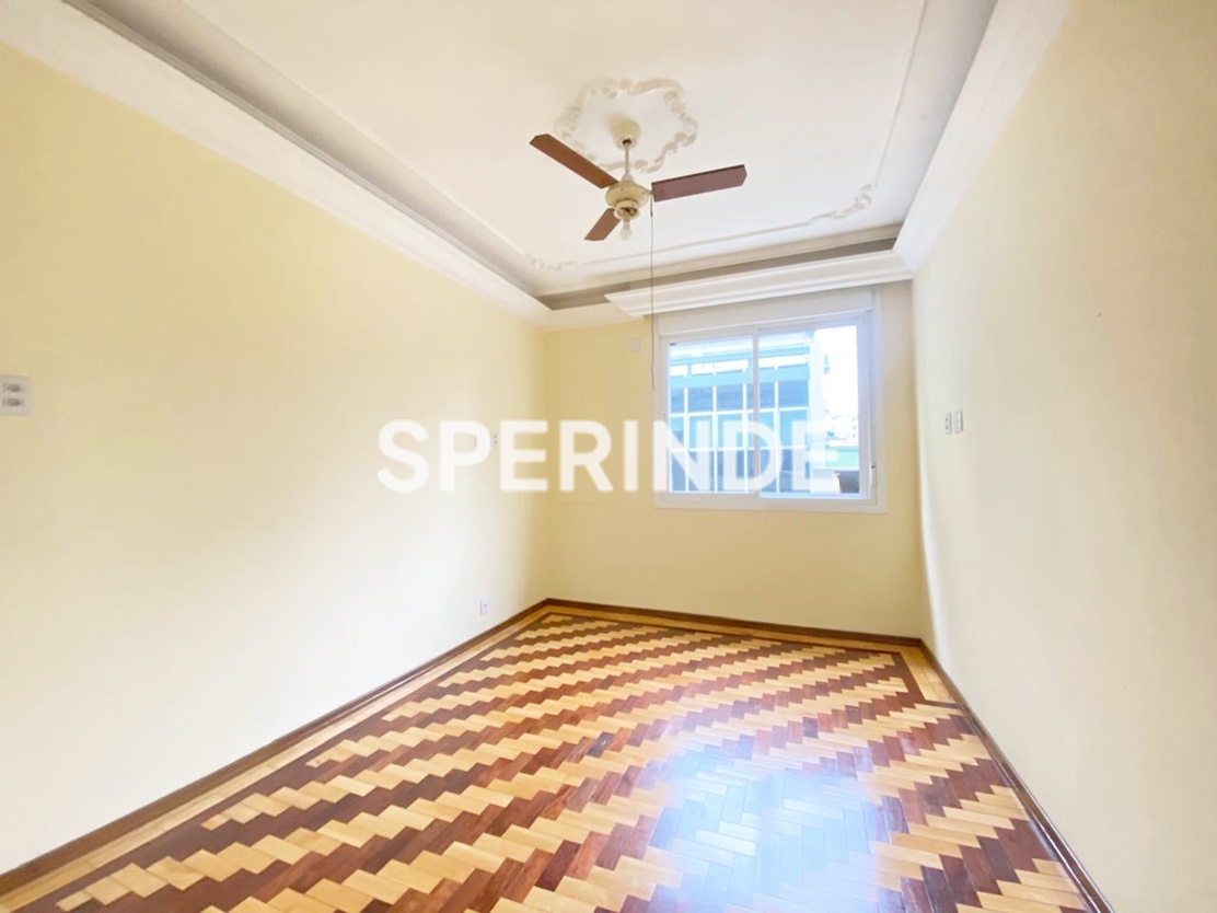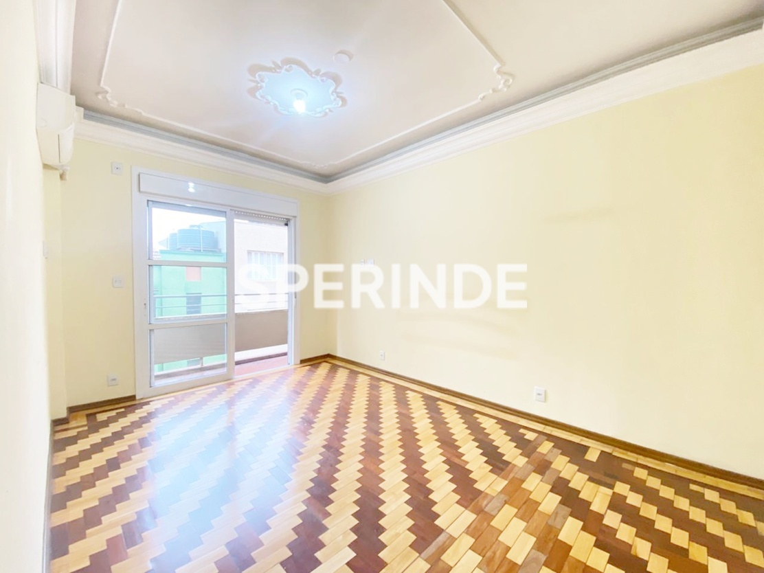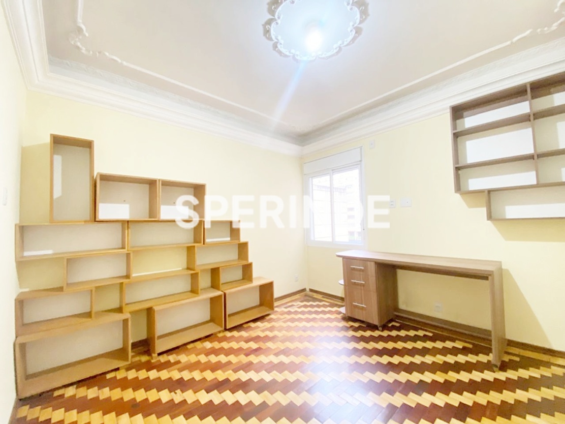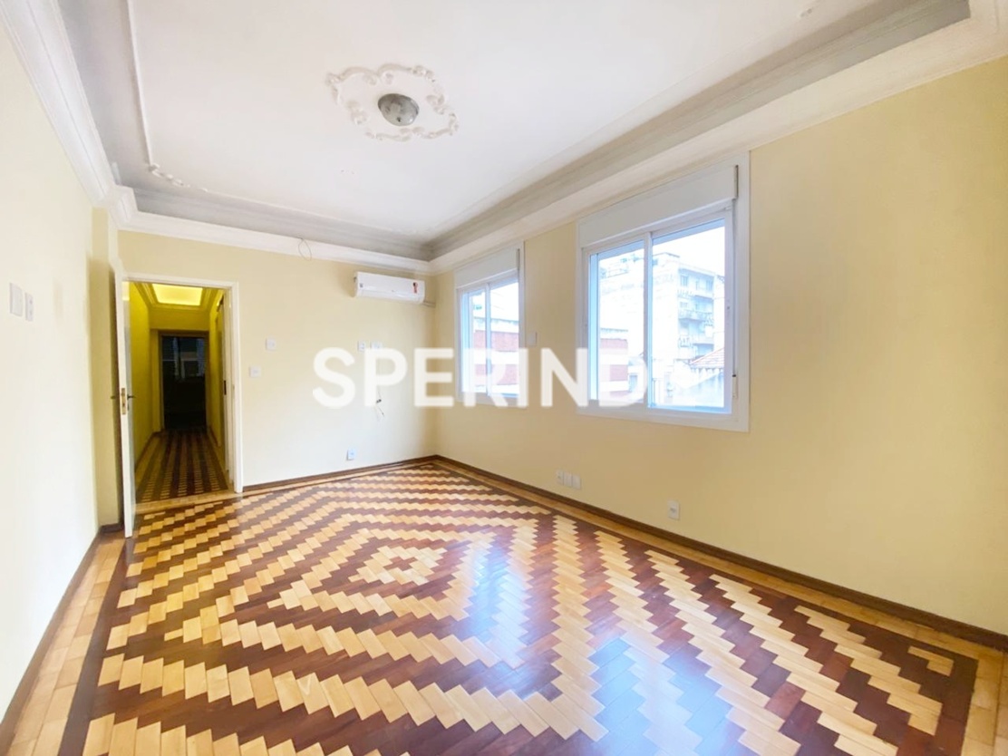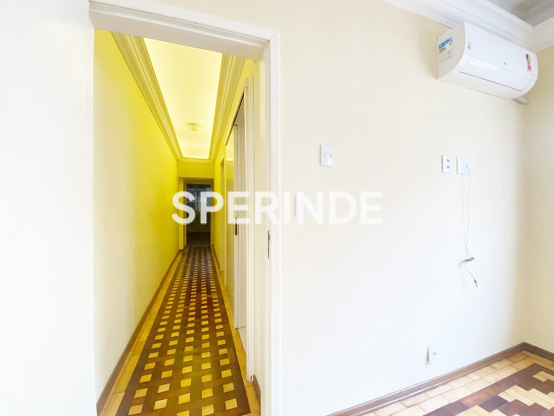 Apartamento para alugar no bairro Centro Histórico em Porto Alegre, com 102m² de área privativa, living amplo com boa iluminação natural e ar-condicionado split, cozinha com pia, armários e fogão, área de serviço com tanque e dependência com banheiro auxiliar. O imóvel conta com 3 quartos, sendo um com sacada e split, além de banheiro social com box de vidro.